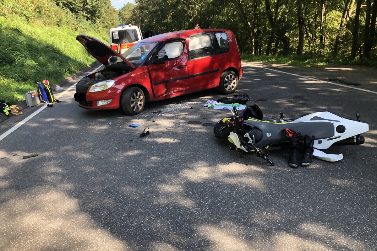Eine 59-Jährige Fahrzeugführerin ist aus einer Grundstückseinfahrt auf die B420 nach links aufgefahren und übersah hierbei den von links kommenden 24-Jährigen Motorradfahrer. Dieser stieß frontal in die linke Fahrzeugseite des PKW's. Der Motorradfahrer wurde hierbei schwerstverletzt und durch einen Rettungshubschrauber in ein Krankenhaus verbracht. Die 59-Jährige erlitt durch den Zusammenstoß leichte Verletzungen und wurde ebenfalls zur weiteren Behandlung in ein Krankenhaus verbracht.