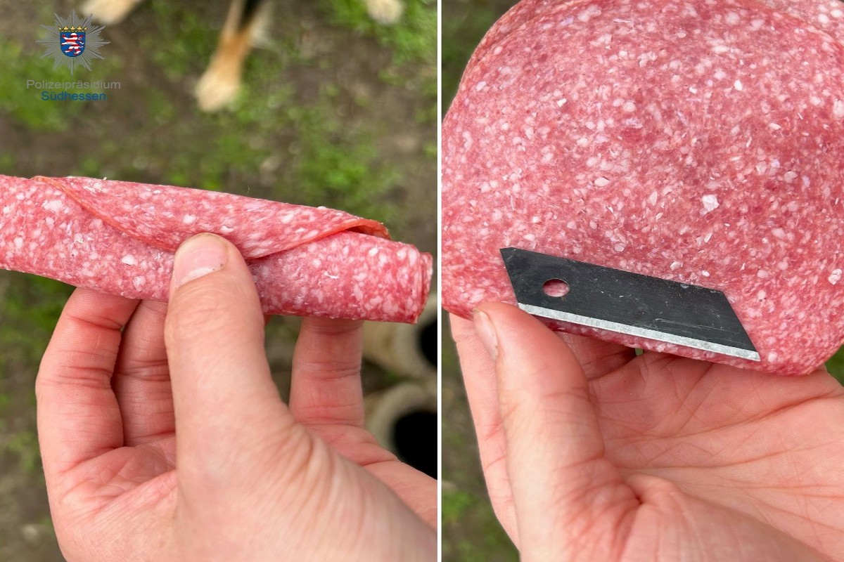 Nach aktuellem Kenntnisstand handelt es sich bei dem mutmaßlichen Hundeköder um eine mit einer Rasierklinge bestückte Salamischeibe. Die Hundebesitzerin konnte den verdächtigen Köder glücklicherweise noch rechtzeitig von ihrem Hund fernhalten. Diesen fand sie bei einem öffentlichen Parkplatz "Im Hasengrund", parallel zur Darmstädter Straße.