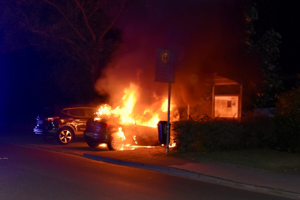 Ein Anwohner verständigte Feuerwehr und Polizei, nachdem er durch einen Knall aufgewacht und beim Blick nach draußen auf das brennende Auto aufmerksam geworden war. Dabei handelte es sich um einen grauen VW Polo, der bei der Bushaltestelle "Haus am Buchenhain" geparkt stand. Einsatzkräfte der Feuerwehr löschten das Feuer und konnten verhindern, dass es auf eine Hecke übergriff; an dem VW Polo entstand jedoch Totalschaden. Durch die Hitzeentwicklung wurde auch ein weiteres geparktes Auto in Mitleidenschaft gezogen.