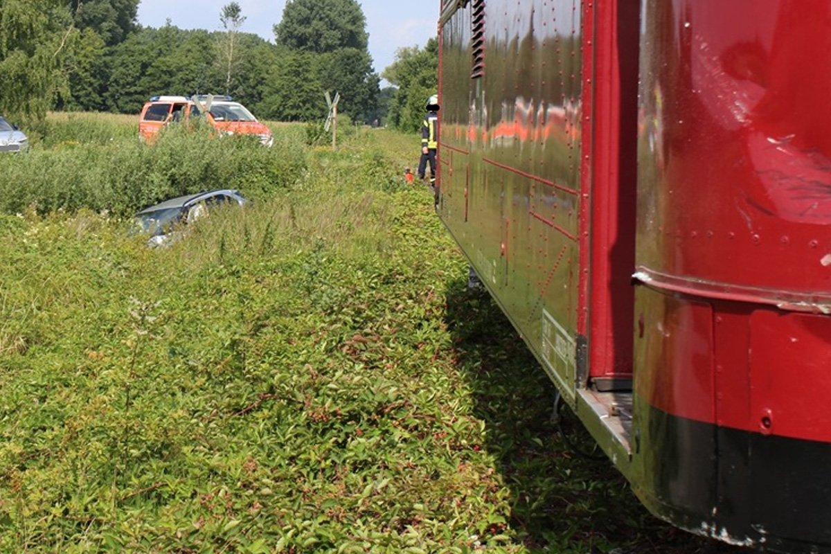 In Rahden wurde am Sonntagvormittag, 10. August 2025, ein Auto von der Museums-Eisenbahn Rahden-Uchte erfasst. Der Wagen drehte sich durch den Aufprall um 180 Grad und landete in einem Graben.
