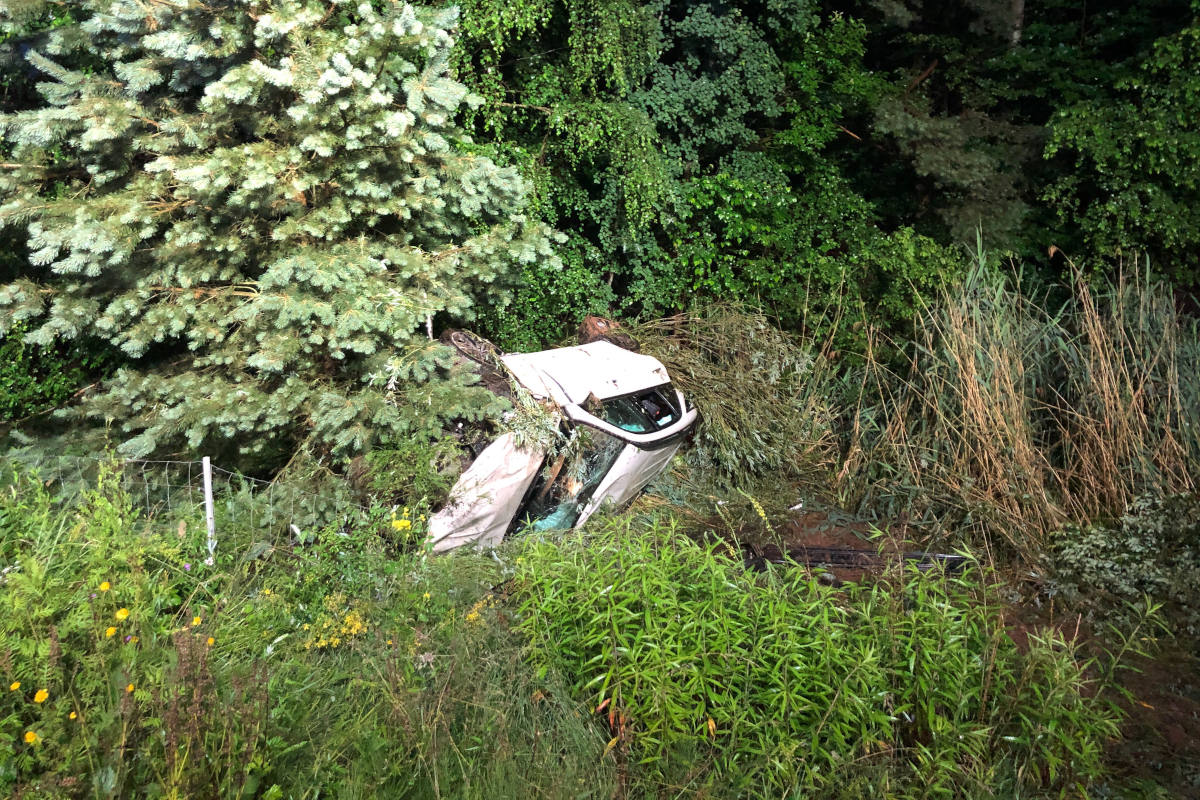 Am Samstagabend kommt der Fahrer eines Mercedes GLE auf der Landstraße zwischen Miesenbach und Mackenbach nach rechts von der Fahrbahn ab und überschlägt sich mehrfach.