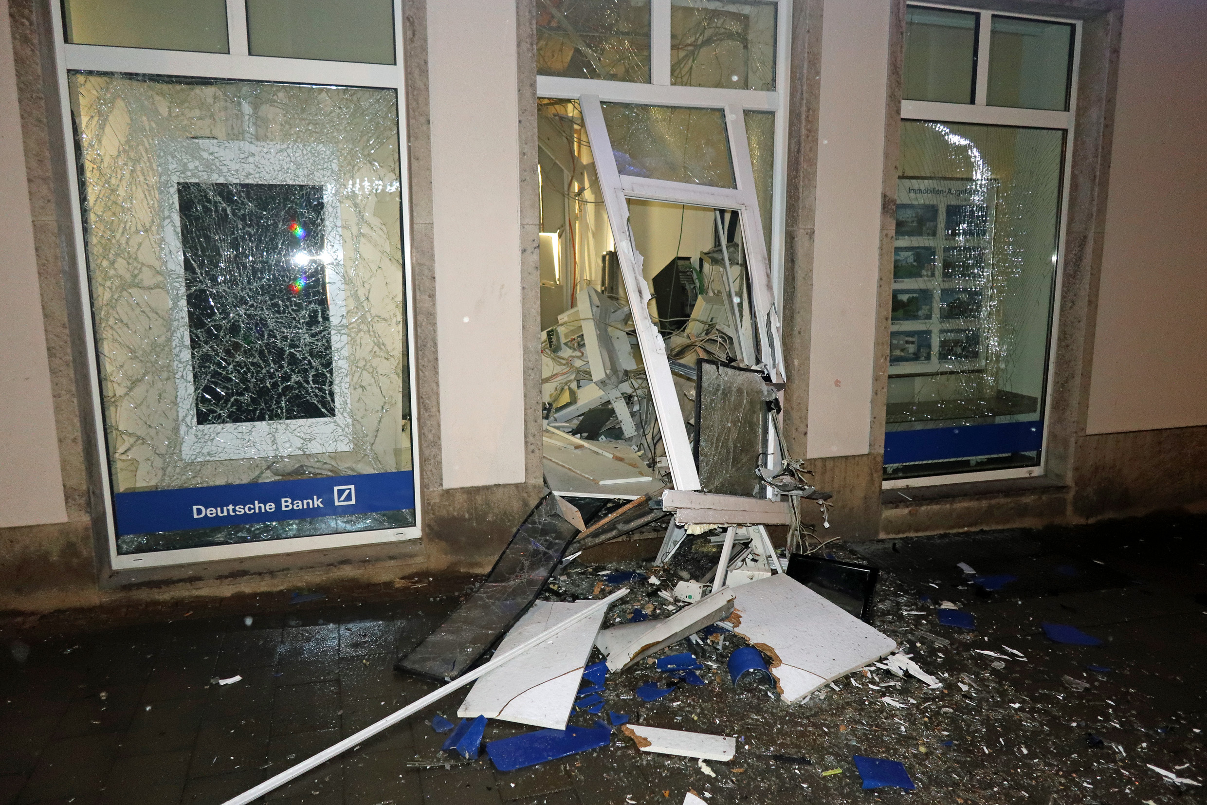 Gegen 04:20 Uhr meldeten aufmerksame Zeugen laute Knallgeräusche von der Düsseldorfer Straße. Alarmierte Einsatzkräfte der Ratinger Polizei stellten fest, dass unbekannte Täter zwei unmittelbar gegenüber befindliche Geldautomaten unterschiedlicher Geldinstitute in der Ratinger Fußgängerzone gesprengt hatten. Betroffen waren ein Geldautomat, welcher in einer Bankfiliale an der Düsseldorfer Straße 22 aufgestellt war, sowie ein Geldautomat, welcher unmittelbar gegenüberliegend an der äußeren Häuserfassade angebracht war.