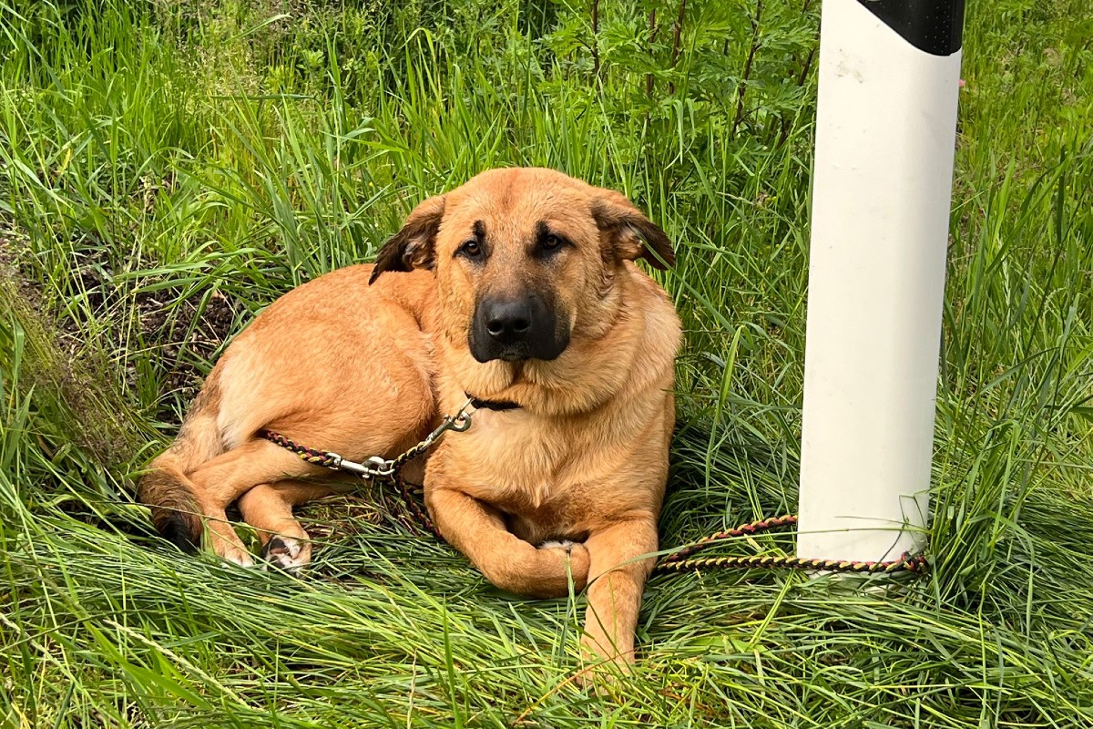 Der mittelgroße, hellbraune und ungechipte Rüde, ein Schäferhund- Mischling, lag verängstigt und zitternd im Grünstreifen.