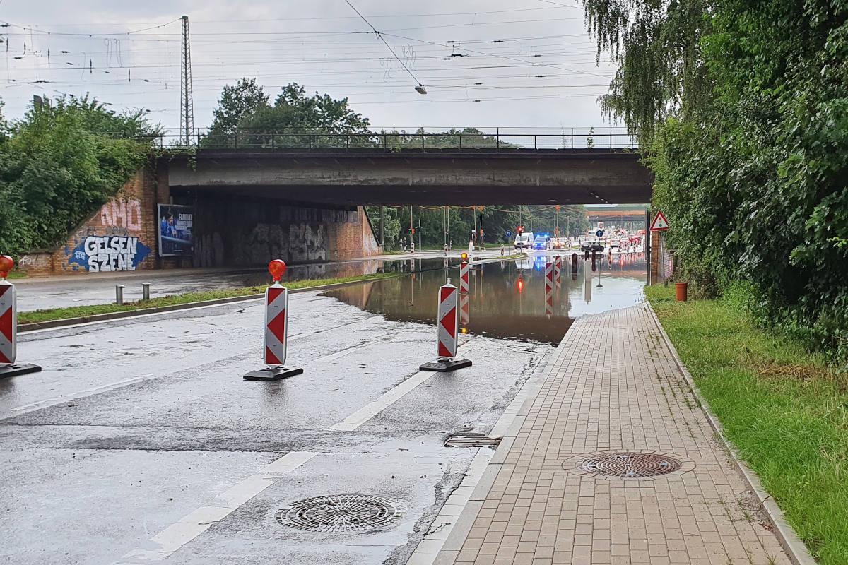 Die Autobahnunterführung der Theodor-Körner-Straße war großflächig überschwemmt und musste komplett gesperrt werden. Da die Feuerwehr vor Ort nicht weiter tätig werden konnte, wurde die Einsatzstelle an den zuständigen Straßenbaulastträger übergeben. Zum Zeitpunkt 20.30 Uhr dauert die Sperrung der Unterführung noch an.