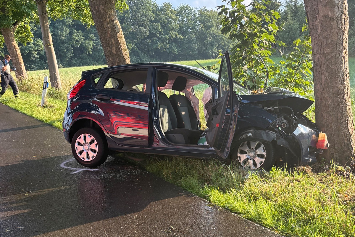 Ein Ford Fiesta war aus bislang ungeklärter Ursache von der Fahrbahn abgekommen und mit einem Baum kollidiert.