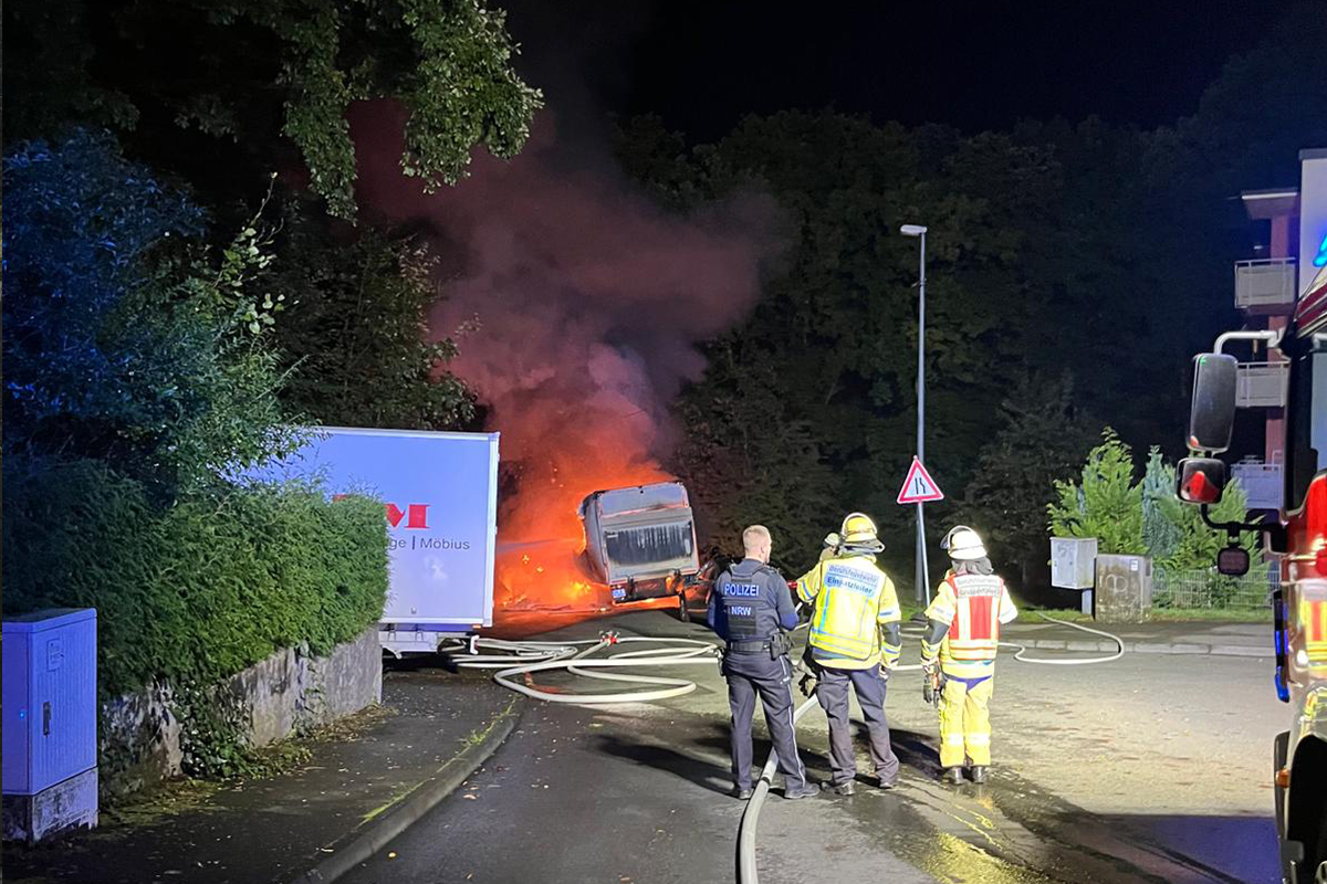 In der Nacht zum Samstag (06.09.2025) geriet in Remscheid ein abgestellter Lkw in Vollbrand. Die Feuerwehr löschte mit mehreren Rohren und setzte Ölsperren, nachdem Betriebsstoffe ins Kanalsystem gelangten.