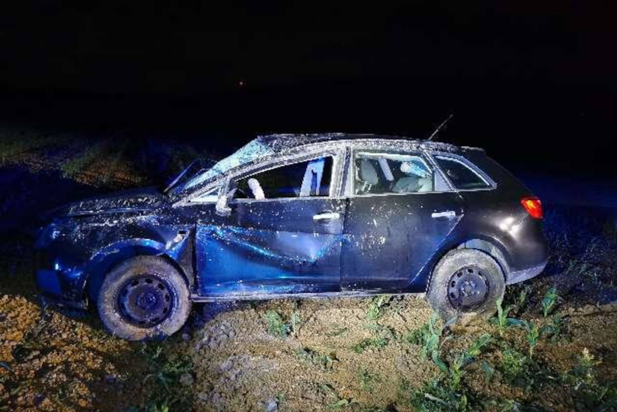 Im Auto kommt es zum Streit zwischen dem Fahrerin und dem stark alkoholisierten Beifahrer. Im Zuge des Streits betätigt der Beifahrer bei voller Fahrt auf der Kreisstraße die Handbremse. Hierdurch kommt der PKW nach links von der Fahrbahn ab, überschlägt sich mehrfach und bleibt nach mehreren hundert Metern auf den Rädern stehen. Wie durch ein Wunder können sich alle Insassen, darunter auch die Kinder im Alter von 10 und 12 Jahren, selbst aus dem Fahrzeug befreien. Alle Beteiligten sind nur leichtverletzt. Gegen den 37-jährigen Beifahrer wurde ein Strafverfahren eingeleitet, zudem wurde bei ihm der Führerschein beschlagnahmt und eine Blutentnahme durchgeführt.