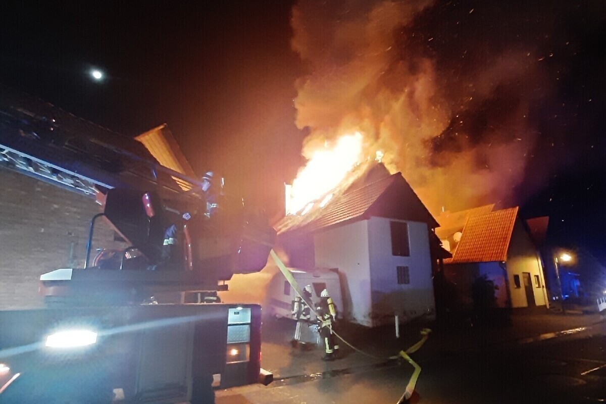 Beim Eintreffen von Feuerwehr, Rettungsdienst und Polizei stand das betroffene Einfamilienhaus bereits in Vollbrand.