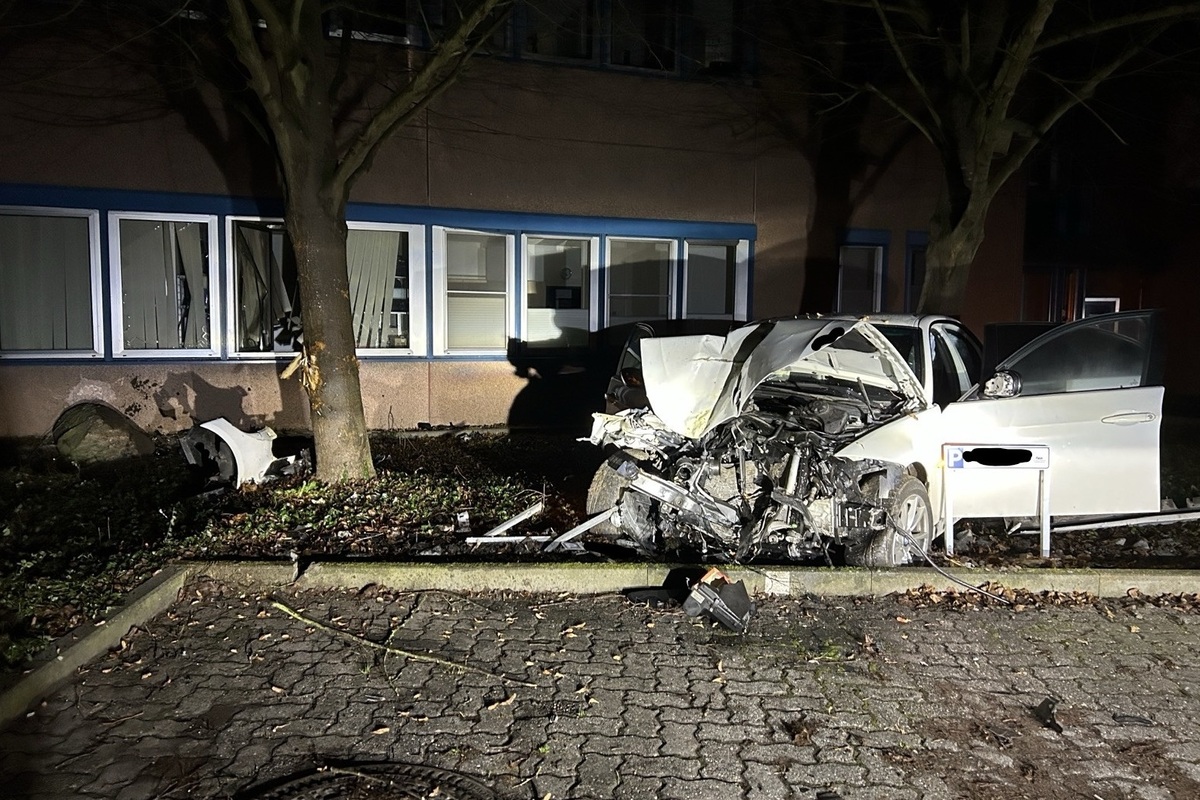 Durch die Kollision wurden das Gebäude und der Baum nicht nur unerheblich beschädigt, am PKW entstand Totalschaden.