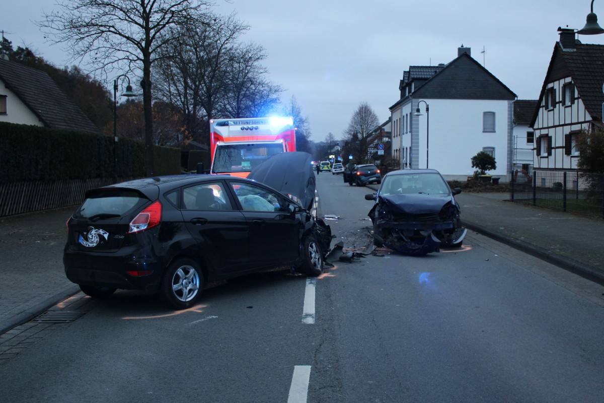 Der Overather touchierte zunächst die linke Fahrzeugseite eines weißen Renaults einer 56-jährigen Rösratherin und anschließend den linken Bereich der Heckstoßstange eines blauen Seats. Da der 50-Jährige aufgrund seines Zustandes weiterhin auf dem gegenüberliegenden Fahrstreifen fuhr, kam es anschließend zu einem Frontalzusammenstoß mit dem schwarzen Ford einer 30-Jährigen aus Overath, die den Unfall trotz eines Ausweichmanövers nicht mehr verhindern konnte.