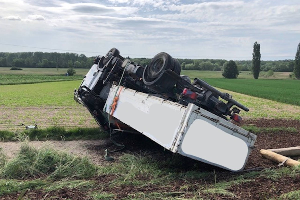 Der LKW-Fahrer verriss daraufhin das Lenkrad und der LKW kippte neben der Fahrbahn auf das Dach. Der LKW hatte Rindenmulch geladen, welches sich über die Fahrbahn verteilte. Die Landstraße musste für die Reinigungsarbeiten und die Bergung des LKW gesperrt werden. Der 39-jährige LKW-Fahrer blieb augenscheinlich unverletzt und wurde zur Untersuchung in ein Krankenhaus gebracht.