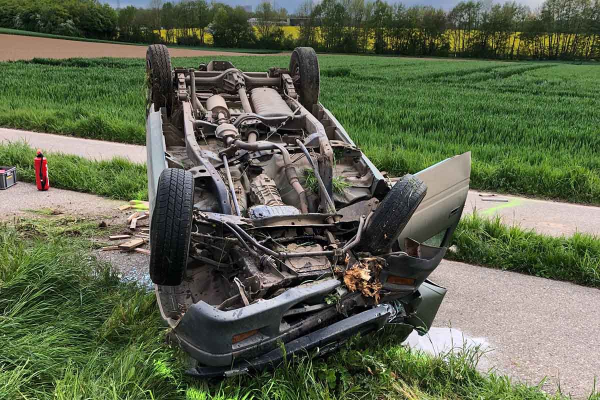 Durch die Wucht des Aufpralls überschlägt sich das Fahrzeug und bleibt auf dem Dach liegen.