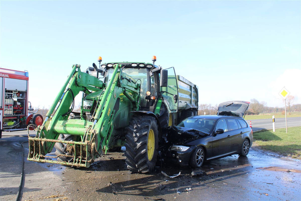 Gegen 11:45 Uhr befuhr ein 31-Jähriger aus Legden mit seinem Schlepper die Bundesstraße 474 in Richtung Coesfeld. Als er nach links in einen Wirtschaftsweg abbiegen wollte, setzte ein 30-jähriger Autofahrer aus Stadtlohn zum Überholen an. Dabei stießen die Fahrzeuge zusammen. Die Beifahrerin des Stadtlohners wurde verletzt und kam mit einem Rettungswagen in ein Krankenhaus.