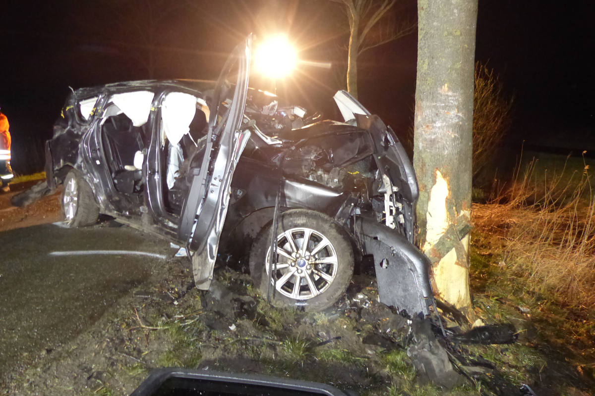 Ein 53-Jähriger aus Stinstedt, Samtgemeinde Börde Lamstedt, kam aus bislang ungeklärter Ursache alleinbeteiligt mit seinem Pkw Ford von der Fahrbahn ab, touchierte einen Baum und kollidierte schließlich frontal mit einem weiteren Baum. Durch die Wucht des Aufpralles wurde der Motorblock so dermaßen in das Fahrzeuginnere gedrückt, dass der allein im Fahrzeug befindliche Fahrzeugführer eingeklemmt und trotz Verwendung schweren Gerätes erst Stunden später von der Feuerwehr befreit werden konnte. Der Mann erlitt bei der Kollision lebensgefährliche Verletzungen, wurde einem Krankenhaus zugeführt und notoperiert. Bei dem Fahrzeugführer wurde eine Alkoholbeeinflussung festgestellt.
