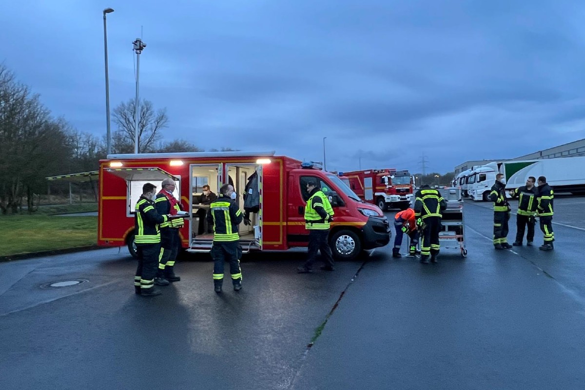 Die Einheiten Menden und Hangelar der Freiwilligen Feuerwehr organisieren zur Zeit den Bereitstellungsraum in Sankt Augustin am Aldi Zentrallager in Buisdorf (Im Mittelfeld). Hier sammeln sich die Einsatzkräfte, die dann in Kolonne nach Köln ausrücken werden. Es sind Kräfte u. a. aus Siegburg, Rheinbach, Bornheim und Wachtberg alarmiert.