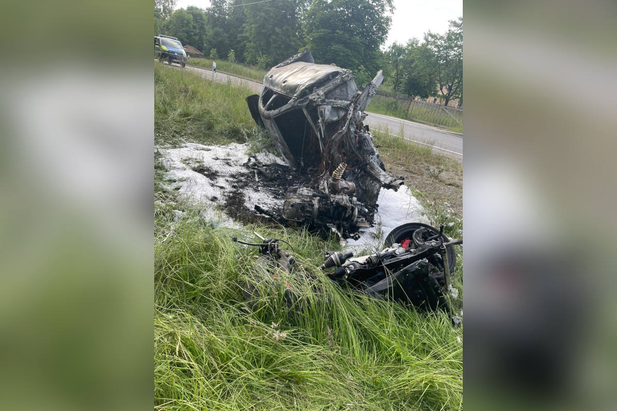 Hierbei verlor er die Kontrolle über sein Fahrzeug, kam von der Fahrbahn ab und touchierte ein Verkehrsschild. Im Straßengraben der Gegenfahrbahn überschlug sich letztlich der Pkw und ging in Flammen auf. Sowohl der Fahrer als auch sein 2 Jahre jüngerer Beifahrer konnten glücklicherweise durch beherzte Ersthelfer aus dem Fahrzeug gerettet werden, ehe dieses kurz darauf beinahe komplett ausbrannte. Während der Löscharbeiten sowie Unfallaufnahme musste die Landstraße kurzzeitig komplett gesperrt werden.