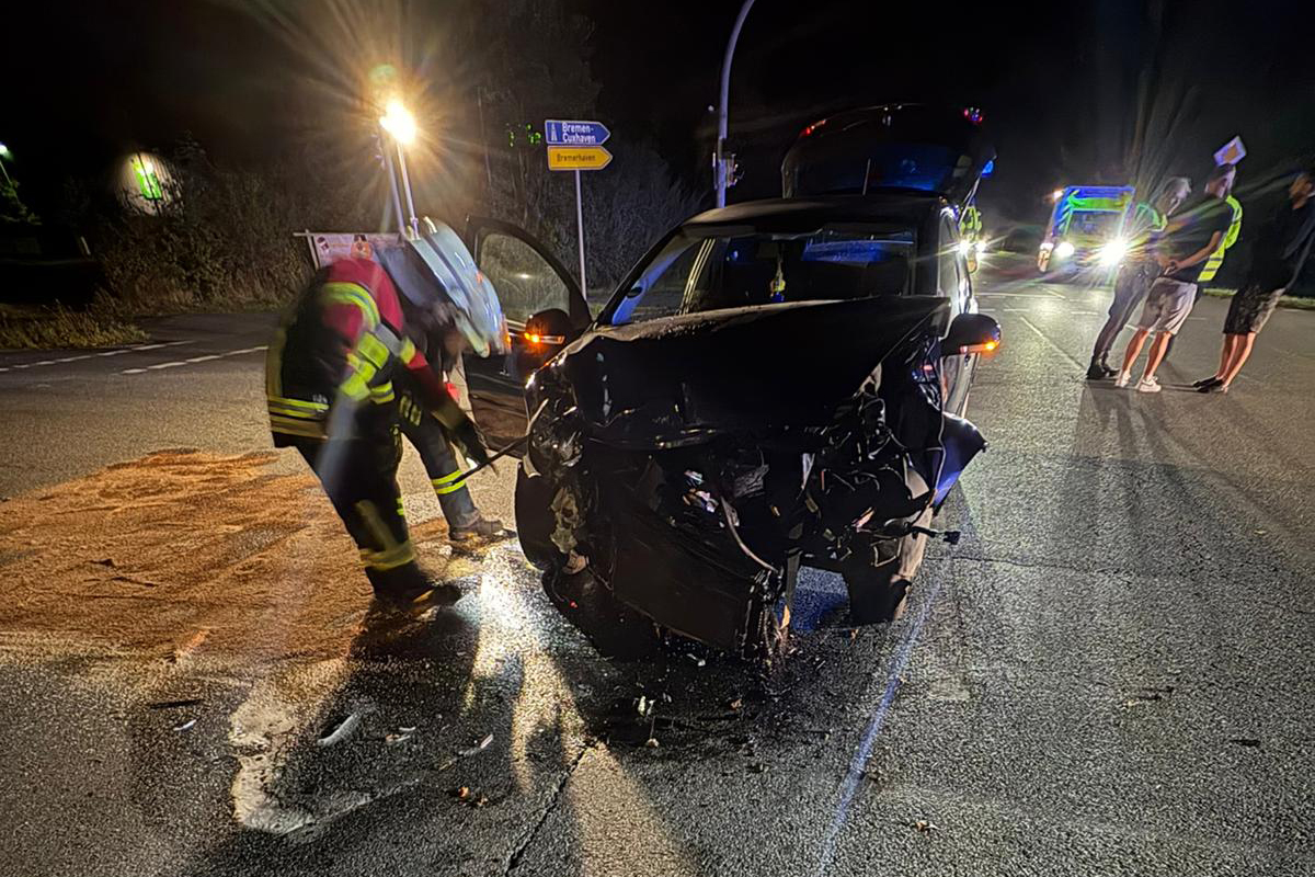 Am späten Samstagabend (06.09.2025) stießen in Schiffdorf zwei Autos auf einer Kreuzung zusammen. Insgesamt sechs Personen waren beteiligt – darunter fünf in einem Fahrzeug. Verletzt wurde niemand. Die Feuerwehr sicherte die Unfallstelle ab.