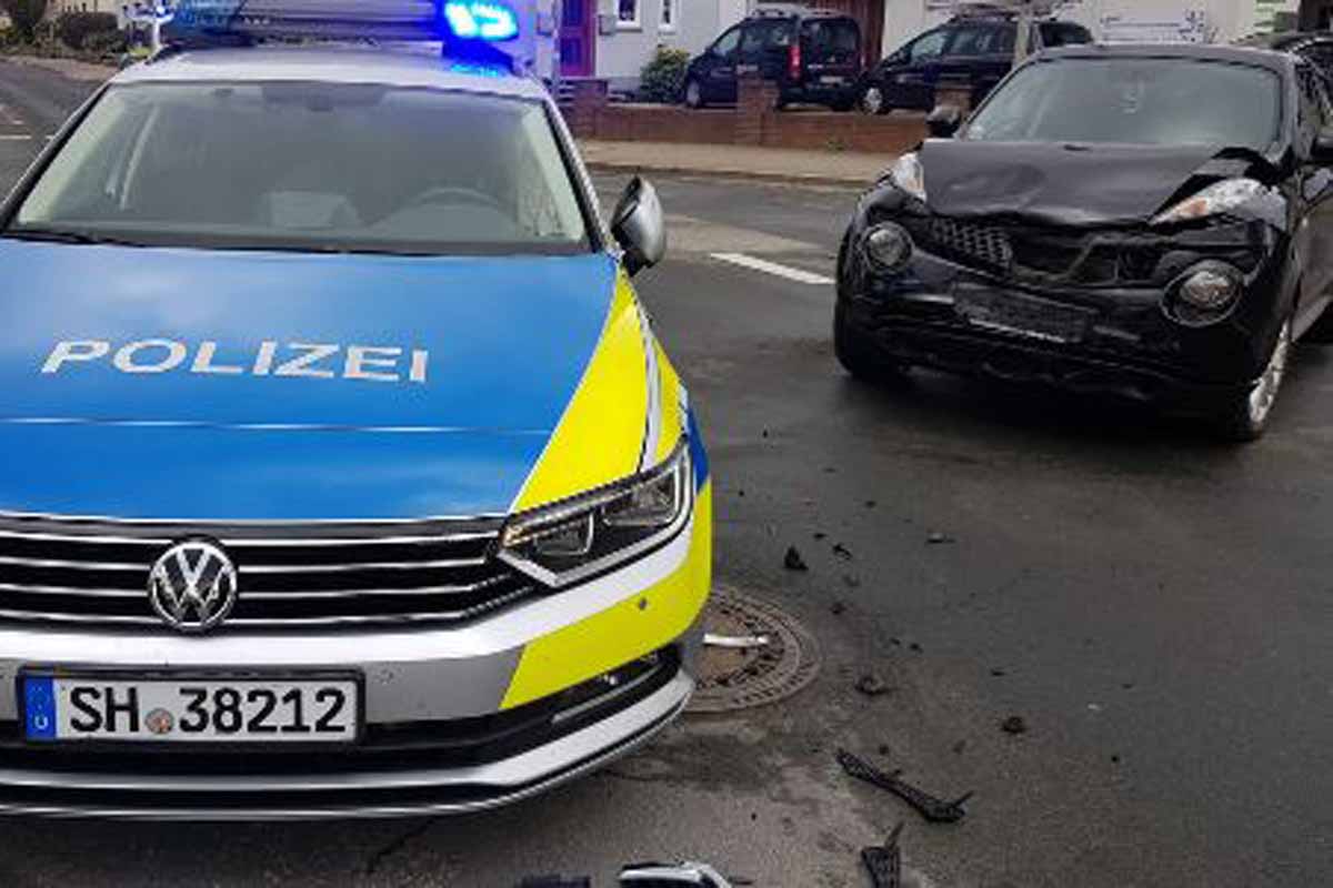 Es kam es zu einem Zusammenstoß, bei dem der Nissan in die linke Fahrzeugseite des Streifenwagens fuhr.