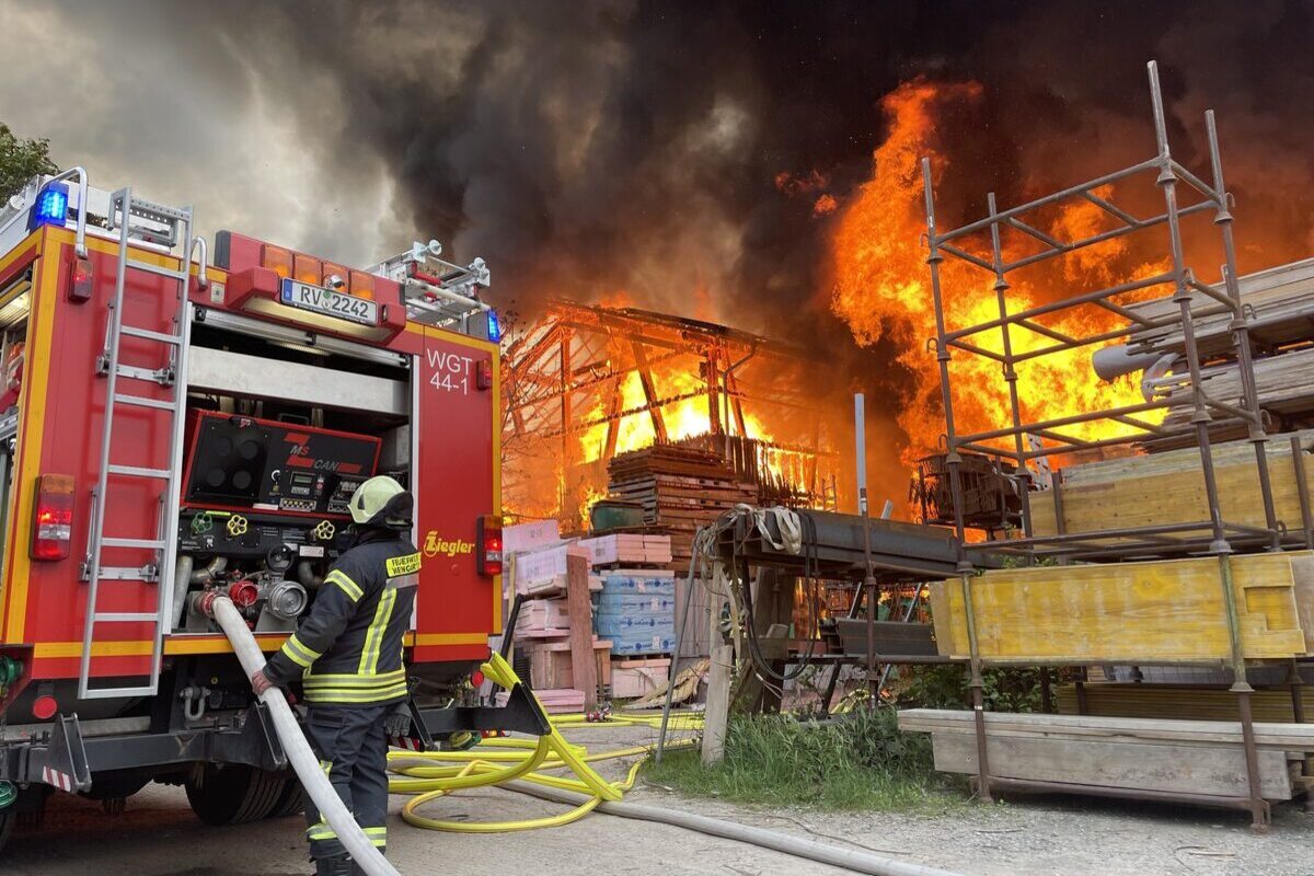 Ein Großbrand zerstörte am Sonntagmorgen zwei Lagerhallen in der Gemeinde Schlier.
