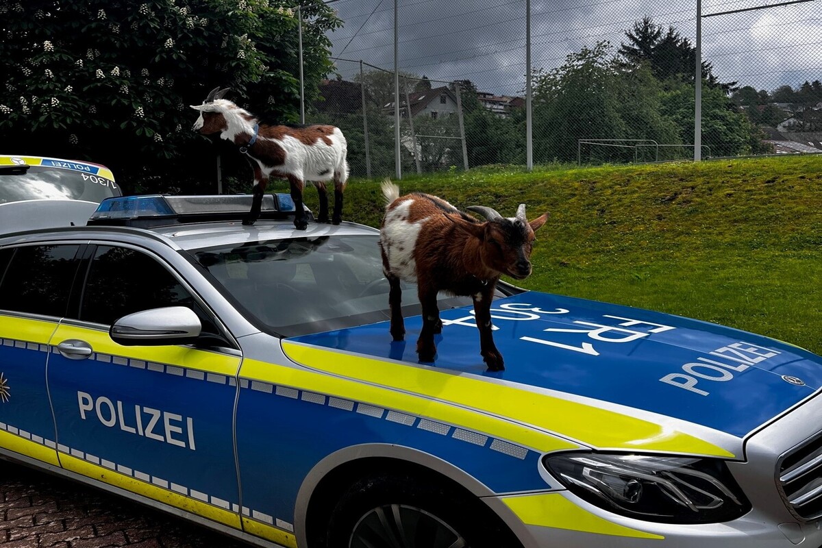 Zwei Ziegen bestiegen den Streifenwagen und konnten nur mit viel gutem Zureden und körperlichen Einsatz dazu bewegt werden, den Einsatzwagen wieder zu verlassen. Nach längeren Versuchen, die Ziegen einzufangen, gelang es den Beamten mit einer Hundeleine und viel Gerede, die drei Ziegen an die Leine zu nehmen.
