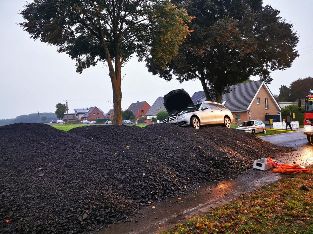 Den zweiten Unfall erlebte dieser Mann dann etwa eine halbe Stunde später als Zeuge mit. Aus der anderen Richtung war eine 51-jährige Schwalmtalerin gekommen, von dort vor das Baumaterial geprallt. Sie hatte mit ihrem Auto abgehoben und war auf dem etwa zweieinhalb Meter hohen Berg zum Stehen gekommen.