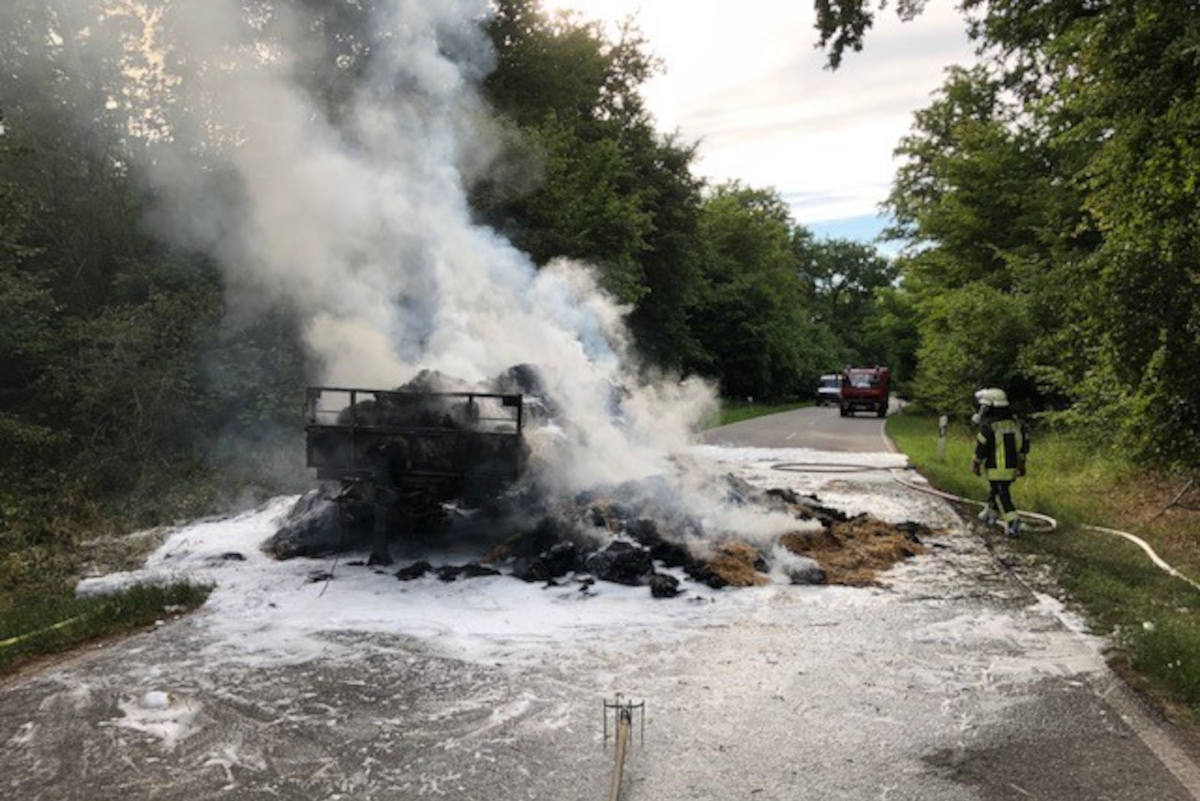 Am heutigen Abend brannte ein mit Stroh beladener Anhänger völlig ab und hierdurch entstand ein Schaden in Höhe von etwa 2.000 Euro.