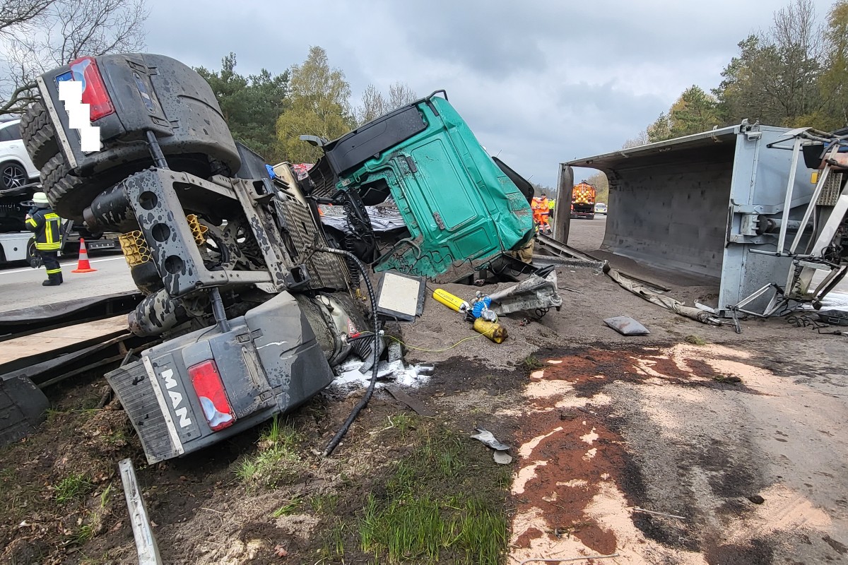 Ein Sattelzug durchbrach in Teilen die Mittelschutzplanke und überschlug sich teilweise, nachdem ein Reifen des Fahrzeugs geplatzt war. Der Fahrzeugführer wurde aus dem Führerhaus geschleudert und lebensgefährlich verletzt ins Krankenhaus gebracht.