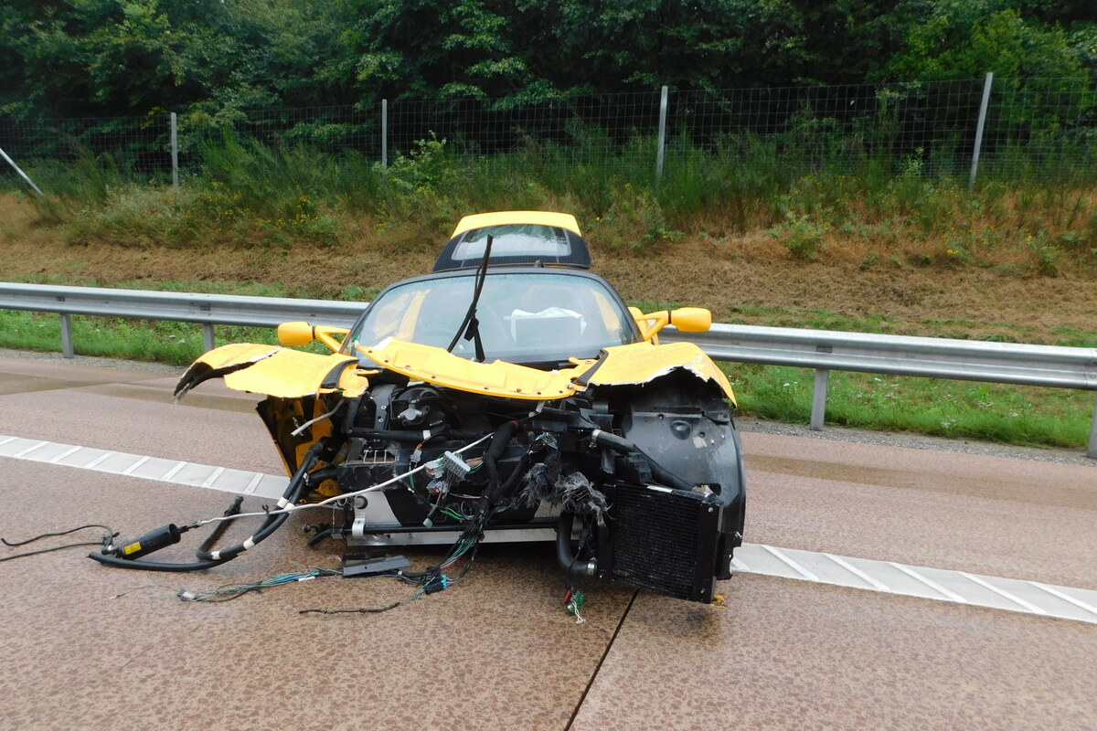 Ein Sportwagen war auf regennasser Fahrbahn in Schleudern geraten, in die Außenschutzplanke geprallt und hierdurch total zerstört. Der 39-jährige Fahrzeugführer aus Hamburg überstand den Unfall glücklicher Weise unverletzt.