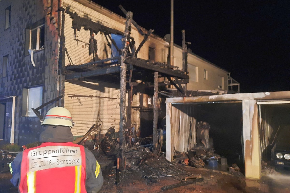 Um 21:49 Uhr wurden die Einheiten Sonsbeck und Hamb, die Drehleiter der Feuerwehr Xanten sowie Rettungsdienst und Polizei mit dem Stichwort "Feuer - Person in Gefahr" zum Taubenweg in Sonsbeck alarmiert. Beim Eintreffen der Feuerwehr brannten eine hölzerne Überdachung und eine angrenzende Garage in voller Ausdehnung, das Feuer hatte bereits auf eine Wohnung im ersten Obergeschoss übergegriffen.
