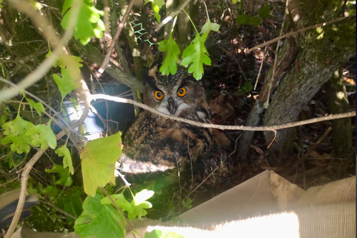 In einem Gebüsch am Fahrbahnrand hielt sich ein verletzter Uhu auf.