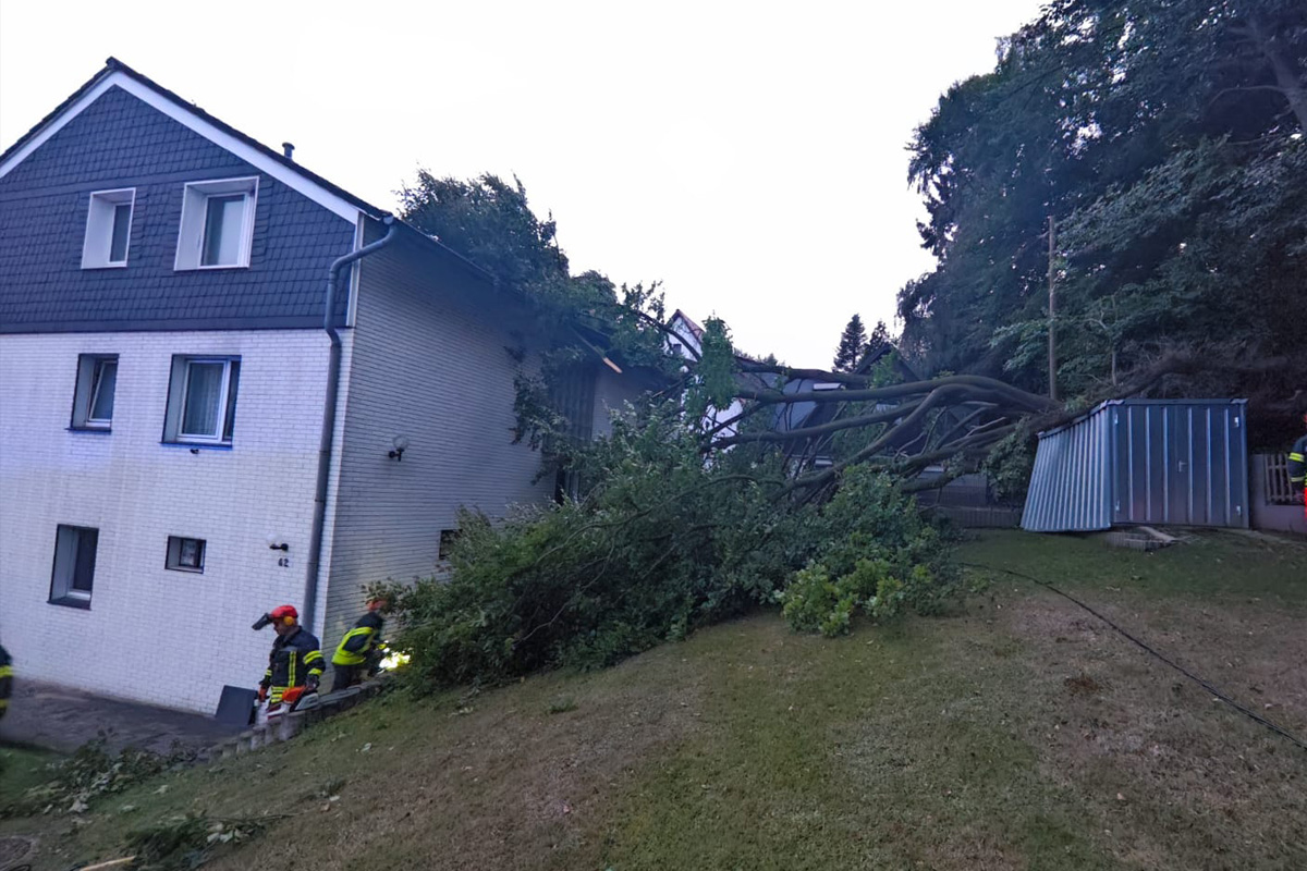 Am Montag (15.09.2025) rückte die Feuerwehr Sprockhövel zu drei sturmbedingten Einsätzen aus. Bäume stürzten auf Straßen, eine Stromleitung sowie auf ein Wohnhaus. Verletzt wurde niemand, die Feuerwehr arbeitete mit Motorsägen und Hubsteiger.