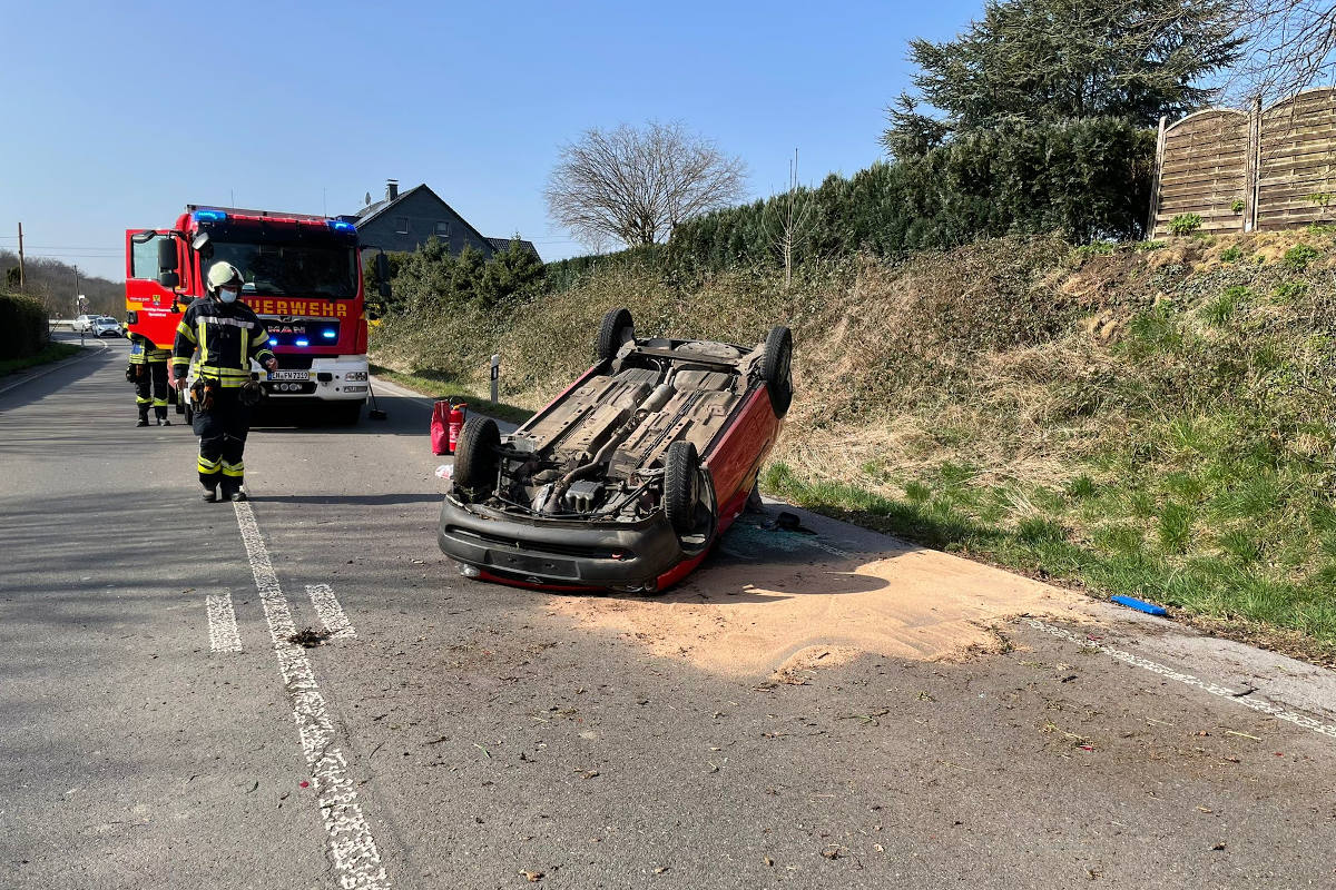 Dort hatte sich ein PKW überschlagen und ist auf dem Dach liegen geblieben. Bei Eintreffen der Feuerwehr hatte sich der Fahrer des Wagens bereits eigenständig aus dem Fahrzeug befreit. Aufgrund von leichten Verletzungen wurde er vom Rettungsdienst versorgt.
