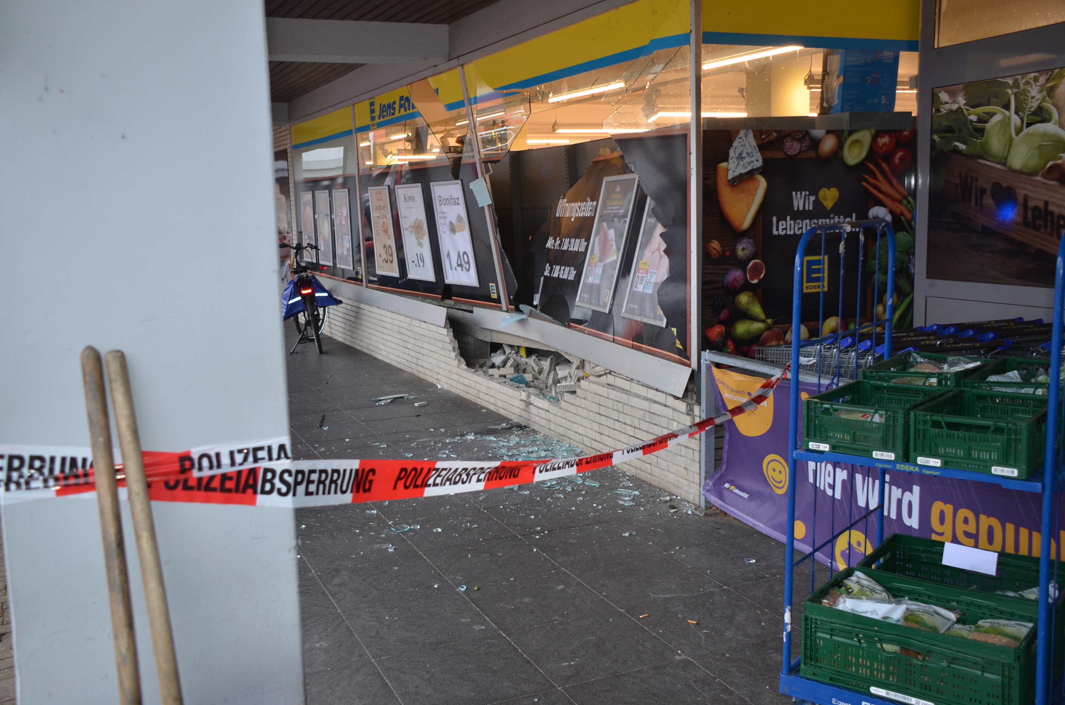 An dem Gebäude, dem Interieur des Ladens, der Ware und dem Fahrzeug sowie einem weiteren geparkten Fahrzeug entstand erheblicher Sachschaden, der Gesamtschaden wird auf mehrere zehntausend Euro geschätzt.