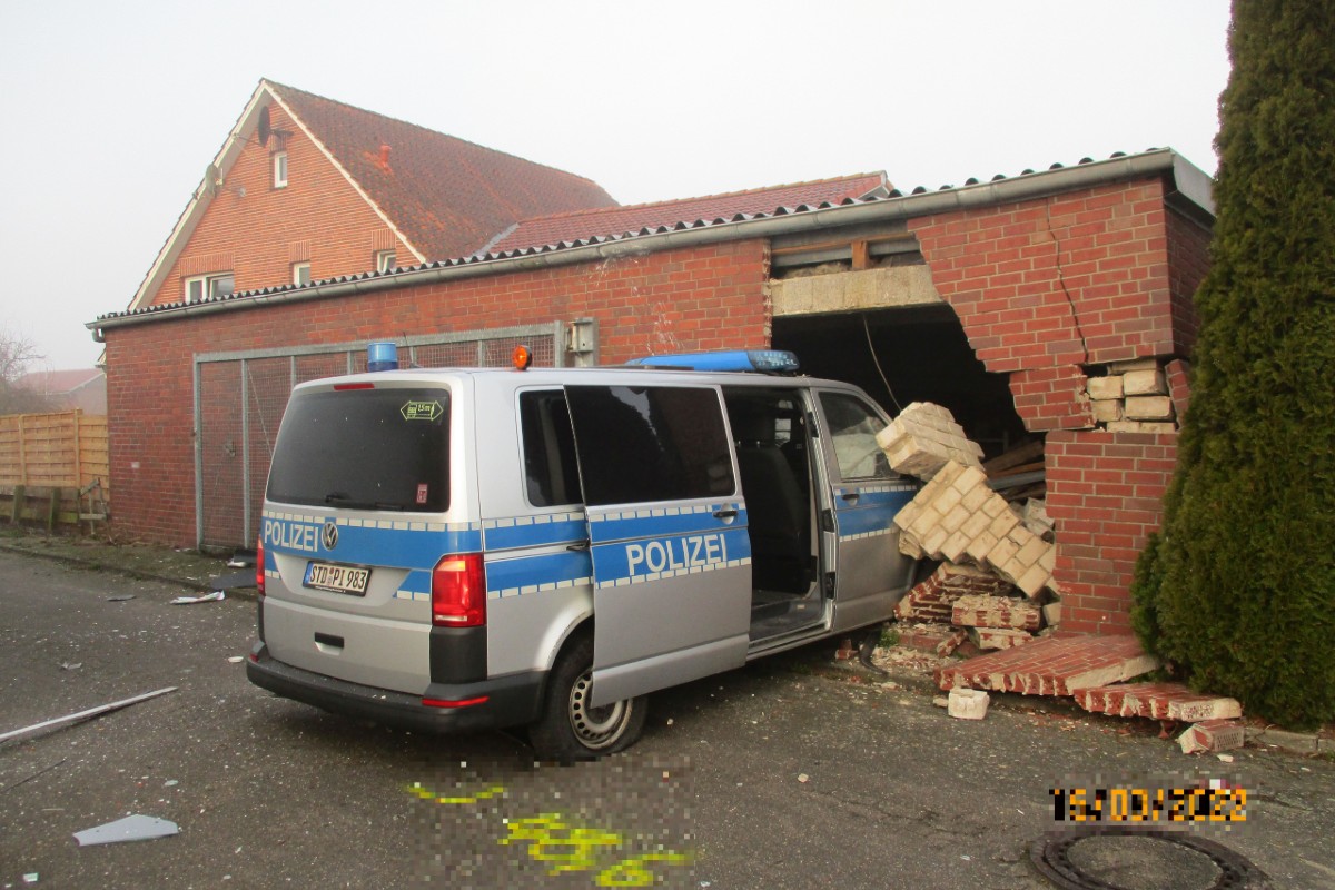 Auf dem Weg zum einem Verkehrsunfall mit eingeklemmter Person ist am heutigen frühen Morgen gegen kurz nach 05:50 h in Assel ein Streifenwagen der Stader Polizei von der Straße abgekommen und in eine Garage geprallt.