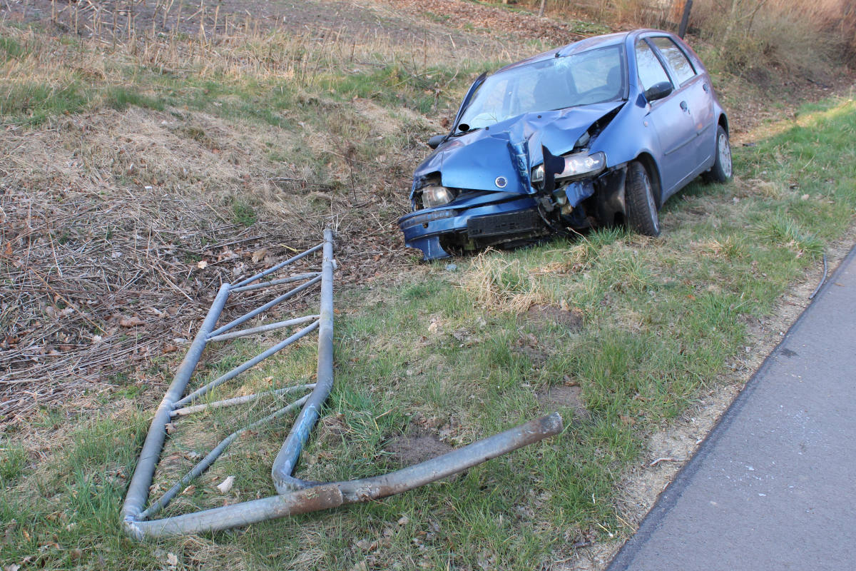 Dieser befand sich ausgangs einer leichten Linkskurve stark beschädigt mit zwei platten Reifen und ohne Kennzeichen im rechtsseitigen Straßengraben. Dem Spurenbild zufolge war der Wagen von der Fahrbahn abgekommen, über eine Grundstückseinfriedung hinweg sowie durch Buschwerk gefahren und mit einem großen Straßenschild kollidiert. Vom Fahrzeugführer fehlte allerdings jede Spur.