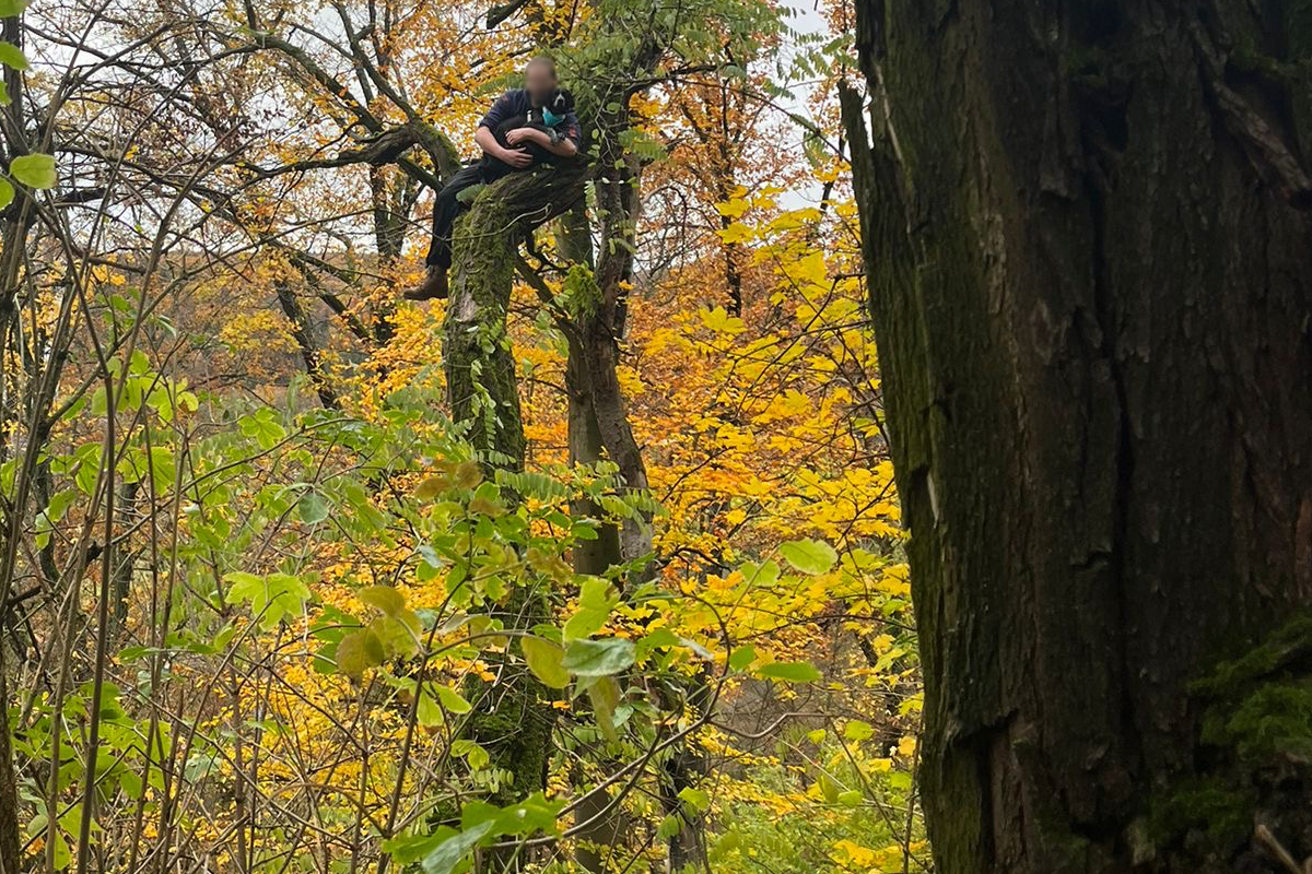 Bei Eintreffen der Feuerwehr saß der Hund mit einem Nachbarn im Baum. Der Nachbar war zu dem hilflosen Hund aufgestiegen und hatte ihn bis zum Eintreffen der Feuerwehr gesichert.