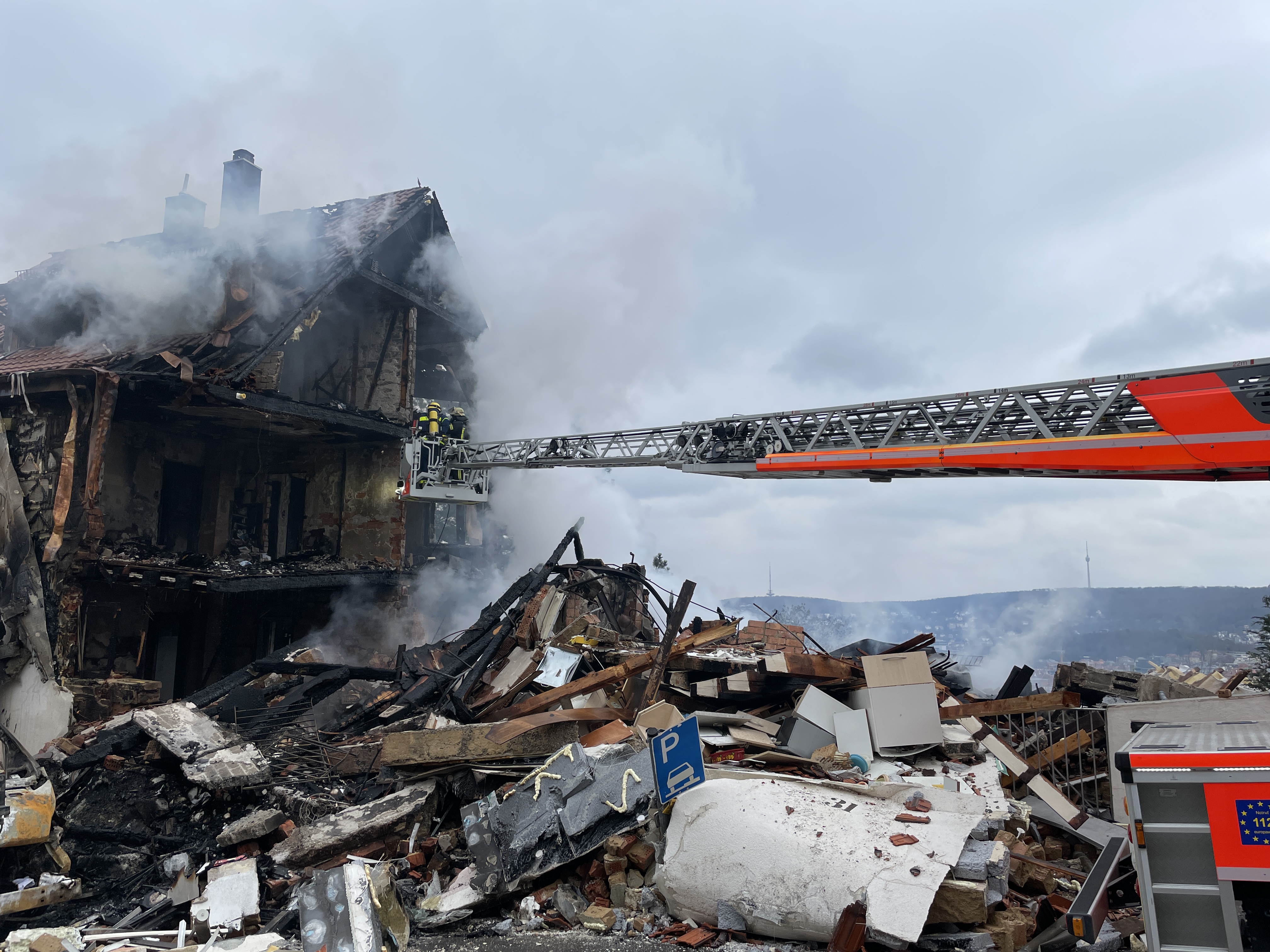 Die Einsatzstelle wird aus der Luft durch eine Drohne der Feuerwehr Stuttgart laufend auf Lageänderungen und Glutnester überwacht. Zwischenzeitlich hat das THW sein Einsatzstellensicherungssystem vor Ort in Stellung gebracht. Damit werden das Trümmerfeld und das Nachbargebäude auf kleinste Bewegungen überwacht. Spürhunde suchen das abgesicherte Trümmerfeld nach der vermissten Person ab.