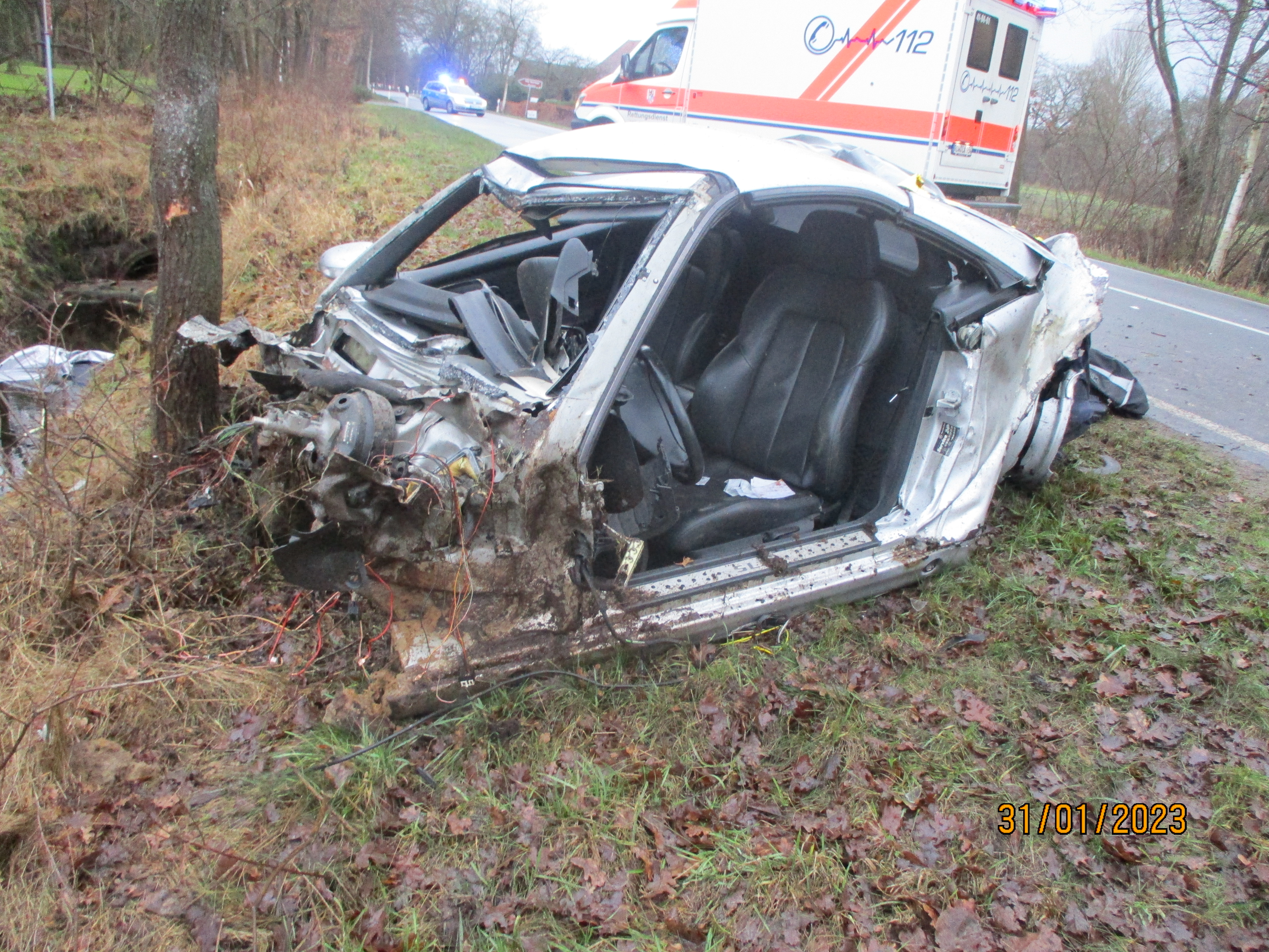 Der Mann war gegen 15.45 Uhr mit seinem Mercedes auf der Landesstraße in Richtung Tiste unterwegs, als er auf gerader Strecke vermutlich aufgrund überhöhter Geschwindigkeit nach links von der Fahrbahn abkam. Im Seitenraum kollidierte das Fahrzeug mit zwei Straßenbäumen und blieb in einem Straßengraben liegen.