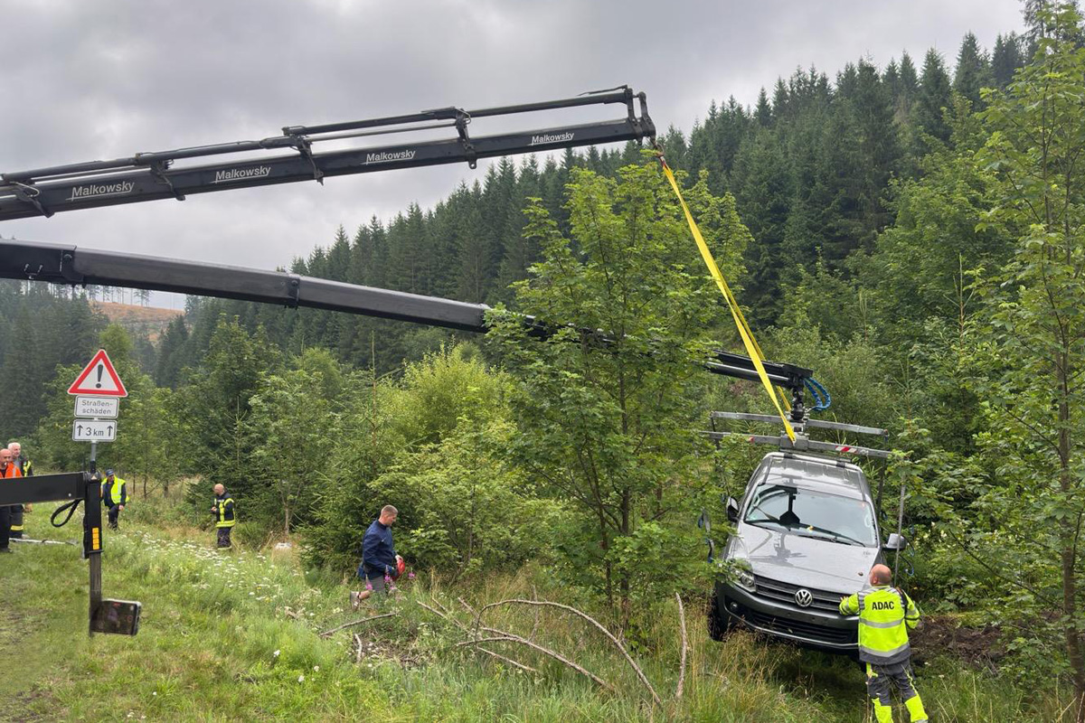 Aufgrund des weit von der Straße entfernten Endstandes des PKW erwies sich die Bergung als schwierig.