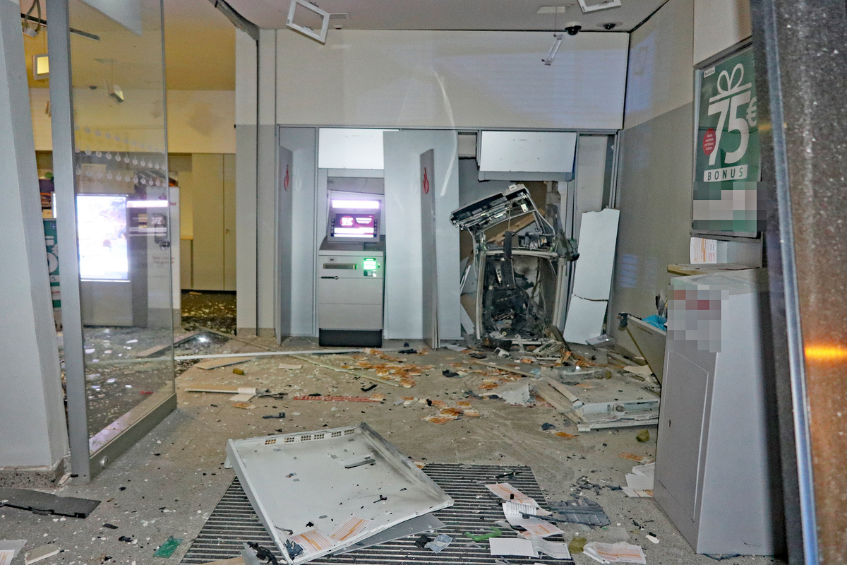 Gegen 2:20 Uhr waren Anwohner der Grünstraße wegen eines lauten Knalls aus ihrem Schlaf gerissen worden. Als die Zeugen aus dem Fenster nach dem Rechten schauten, sahen sie Rauch aus der dortigen Eckfiliale einer Bank aufsteigen.