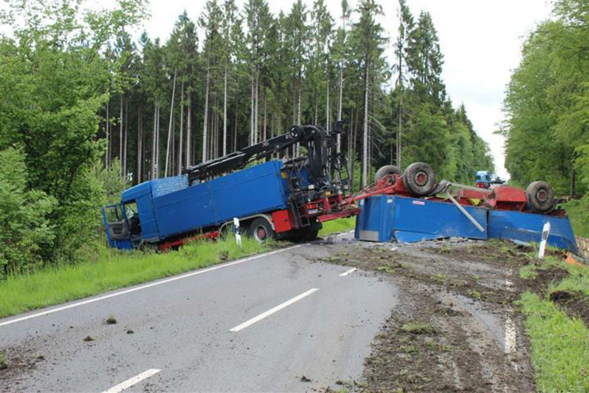 Auf einer langen Geraden geriet er mit seinem Anhänger vermutlich aus Unaufmerksamkeit leicht nach rechts von der Fahrbahn ab. Beim Versuch wieder auf die Fahrbahn zurückzusteuern, schaukelte sich das Gespann auf. Hierdurch kippte der Anhänger um und der LKW kam nach links von der Fahrbahn ab, wo er im Straßengraben quer zur Fahrbahn zum Stehen kam. Der Anhänger kam rücklings auf der Fahrbahn zum Liegen.