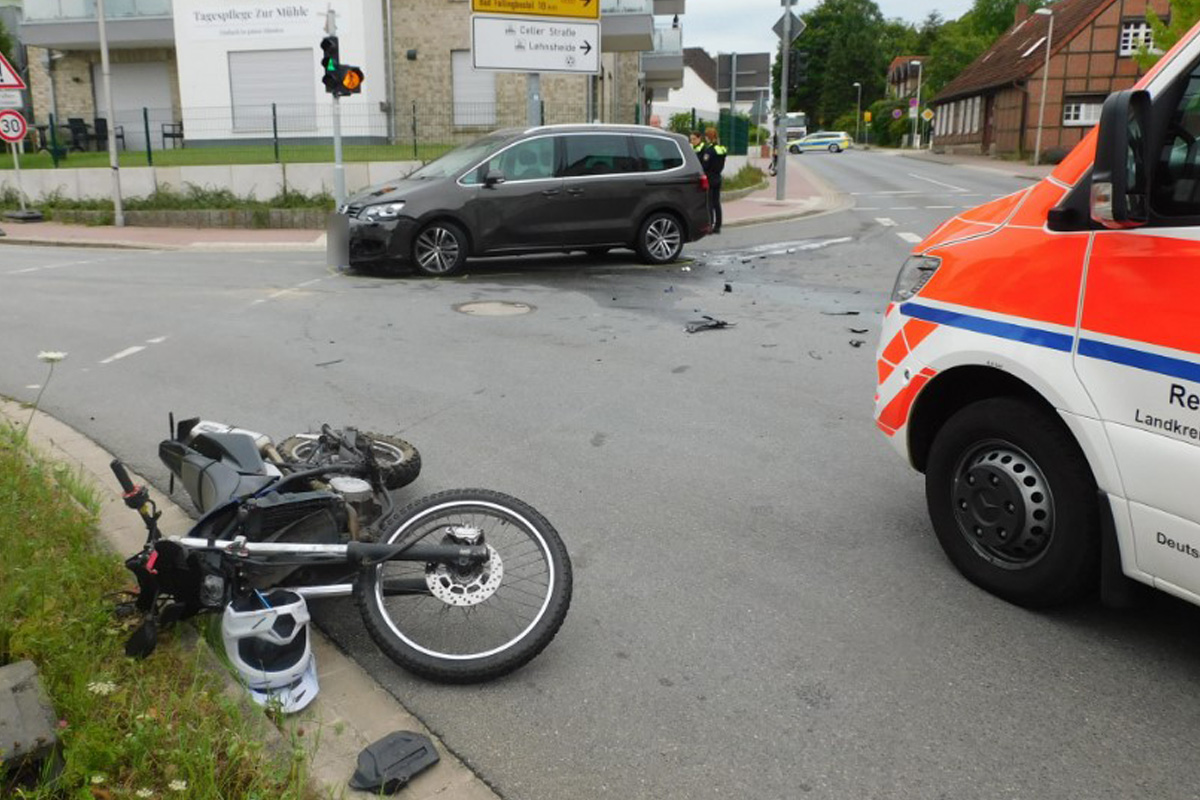 Am Sonntag, den 6. Juli 2025, verlor ein 17-jähriger Motorradfahrer in Visselhövede die Kontrolle über sein Leichtkraftrad und wurde im Gegenverkehr von einem Auto erfasst. Er kam mit lebensbedrohlichen Verletzungen ins Krankenhaus.