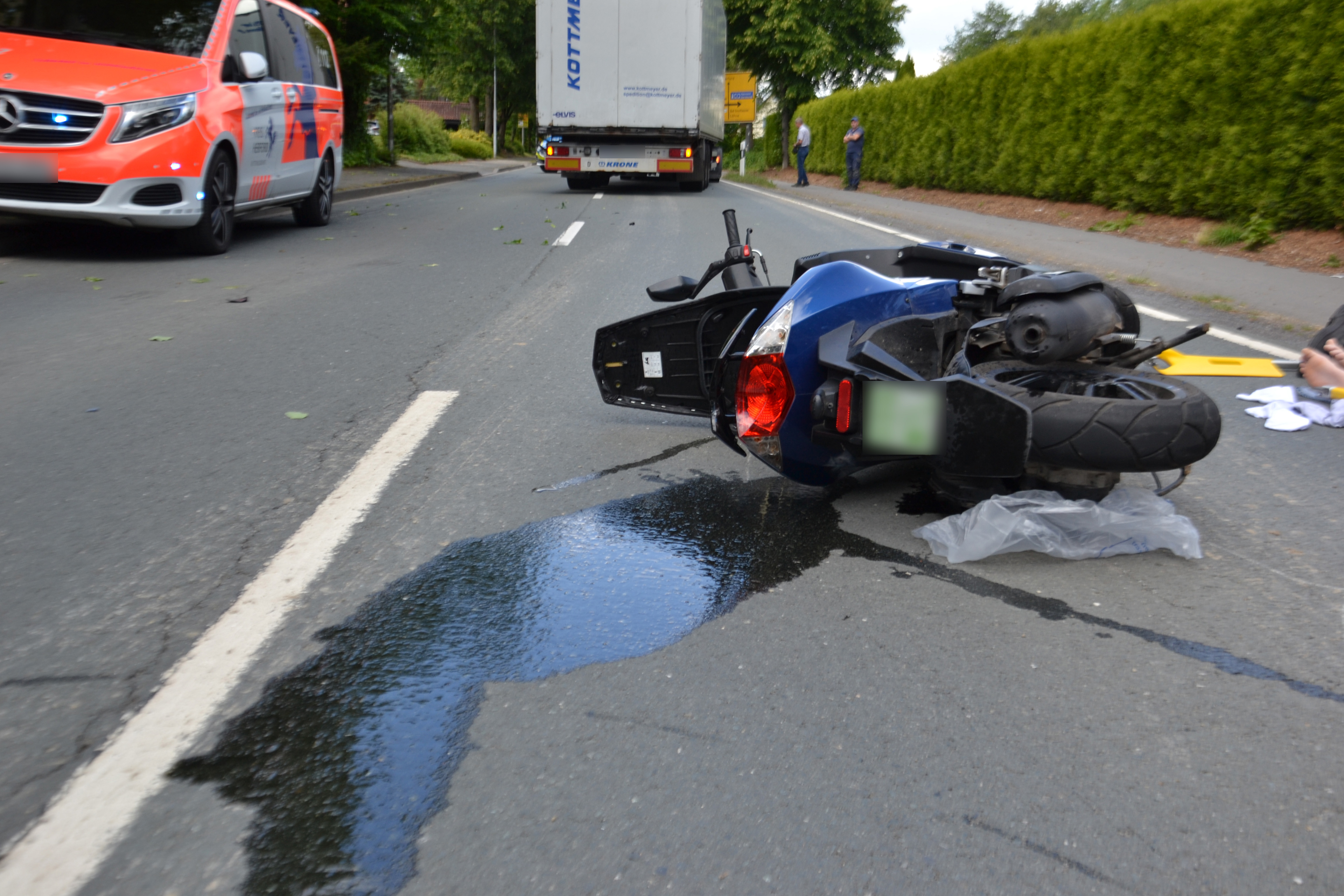 Der beschädigte Roller musste von der Unfallstelle abgeschleppt werden. Zur Beseitigung von herauslaufenden Betriebsmitteln wurde die Feuerwehr zur Unterstützung hinzugerufen.
