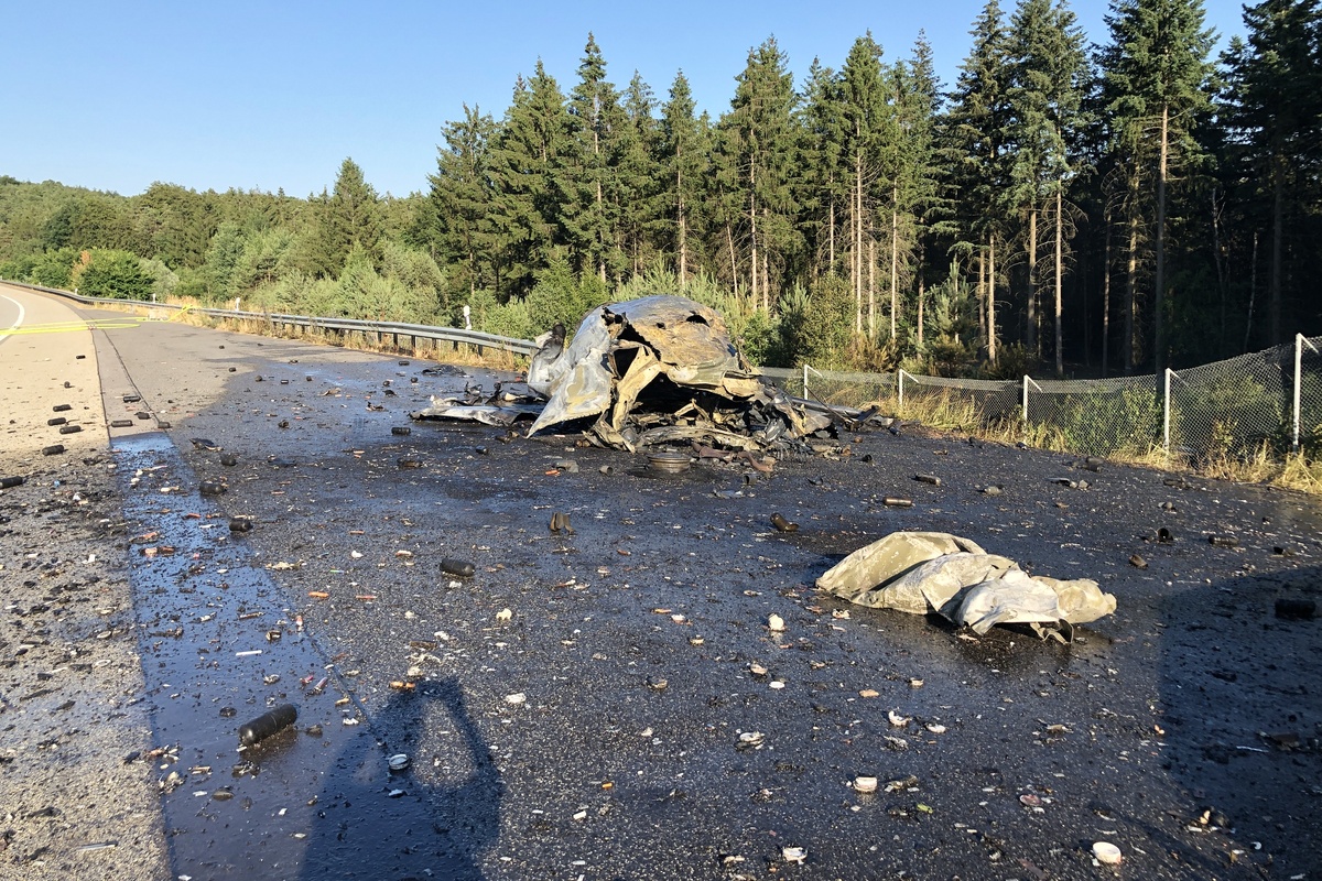 Am 25.06.2023, gegen 17:40 Uhr fährt ein Fahrer aus Nordrhein-Westfalen auf der BAB 6 von Saarbrücken in Richtung Mannheim. Nach Enkenbach, kurz vor der Wildbrücke, bemerkt er, dass Rauch aus dem Motorraum kommt und schafft es sein Fahrzeug an einer Behelfsabfahrt abzustellen. Gerade, als er und sein Beifahrer das Fahrzeug verlassen haben, fängt dieses an zu brennen. Unglücklicherweise waren im Fahrzeug diverse CO2-Behälter und Einwegzigaretten geladen. Durch die enorme Hitze kam es zu zahlreichen Detonationen, wobei Trümmerteile bis auf die Gegenfahrbahn flogen. Hierdurch fing auch die Böschung in Fahrtrichtung Saarbrücken an zu brennen.