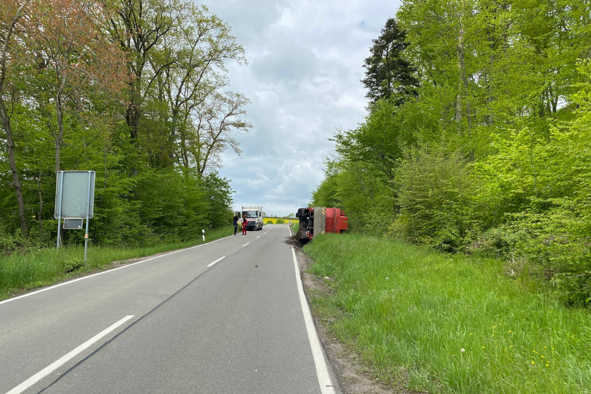 Vermutlich durch eine kurze Unachtsamkeit kam der Fahrer in einer Rechtskurve auf den Grünstreifen. Da dieser aufgrund des vorangegangenen Regens sehr weich war, kam der Mobilkran dann von der Straße ab und kippte um.
