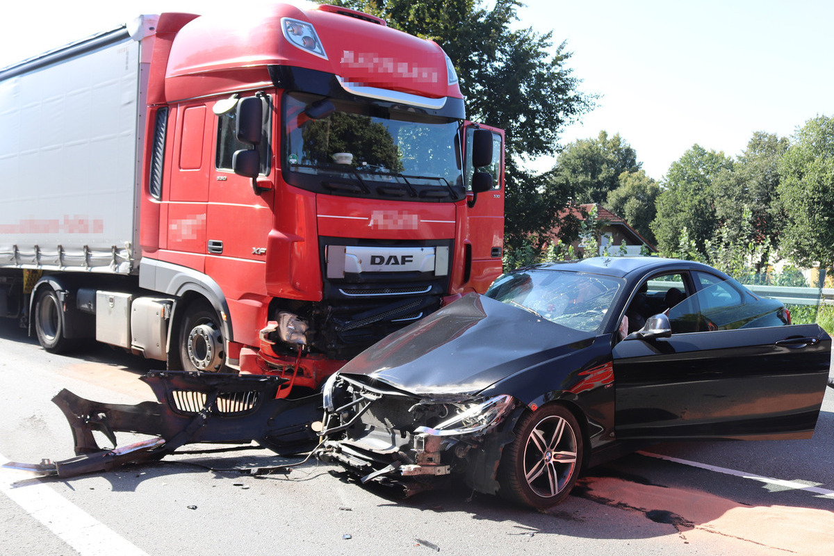 Zur gleichen Zeit kam aus der entgegengesetzten Richtung ein Lkw. Der 56-jährige Lkw-Fahrer aus Tschechien versuchte auszuweichen, konnte einen Zusammenstoß jedoch nicht verhindern. Der Lkw erfasste den BMW und schob ihn rund 55 Meter vor sich her. Dabei wurde ein weiterer Lkw, welcher sich an der Einmündung zur B252 befand, touchiert und leicht beschädigt.