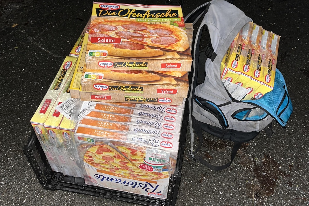 Am Freitag, 26.01.2024, gegen 02:20 Uhr, haben Polizeibeamte in Warstein auf der Sankt-Poler-Straße eine verdächtige Person festgestellt, die eine Plastikbox und einen Rucksack mitführte, in denen sich 32 original verpackte und tiefgefrorene Fertig-Pizzen befanden.