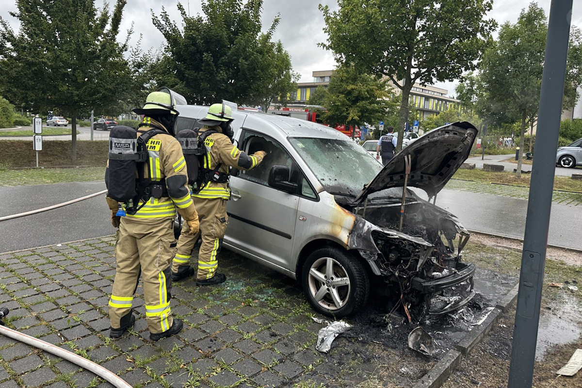 Am heutigen Morgen (22.07.2025) gegen 07:00 Uhr wurde die Feuerwehr Weinheim zu einem Brand in der Röntgenstraße alarmiert. Eine brennende Straßenlaterne verursachte durch das Herabtropfen von brennendem Kunststoff einen Brand an einem PKW.