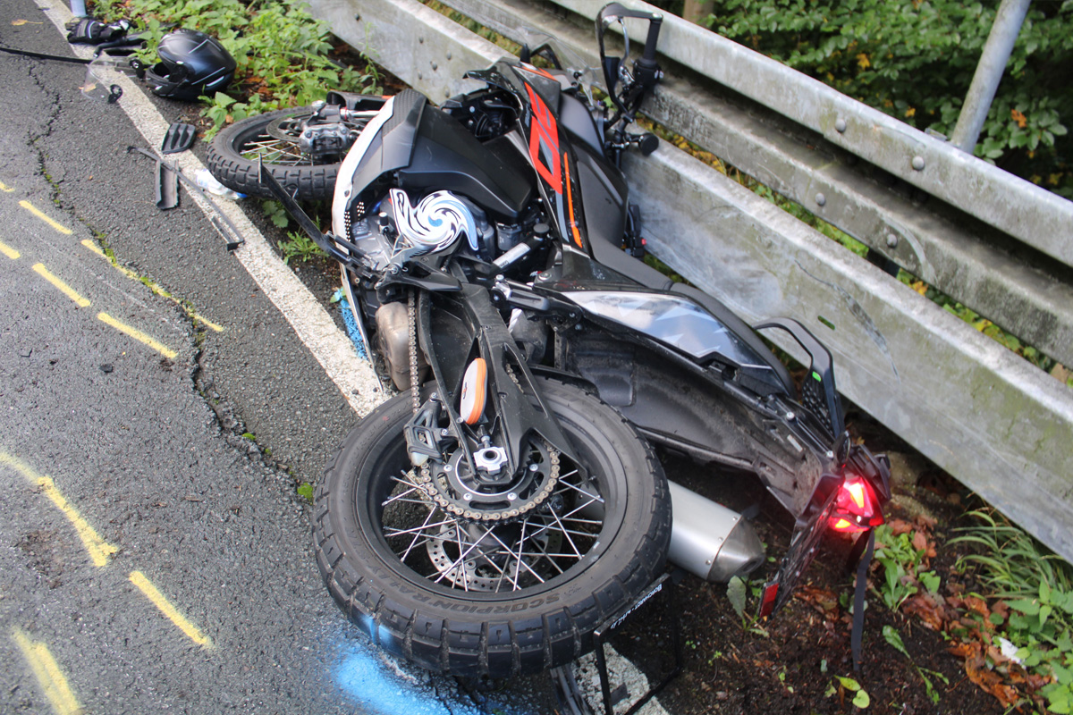 In einer Kurve verlor er aus bislang unbekanntem Grund die Kontrolle über sein Motorrad der Marke KTM und stürzte auf die Fahrbahn.