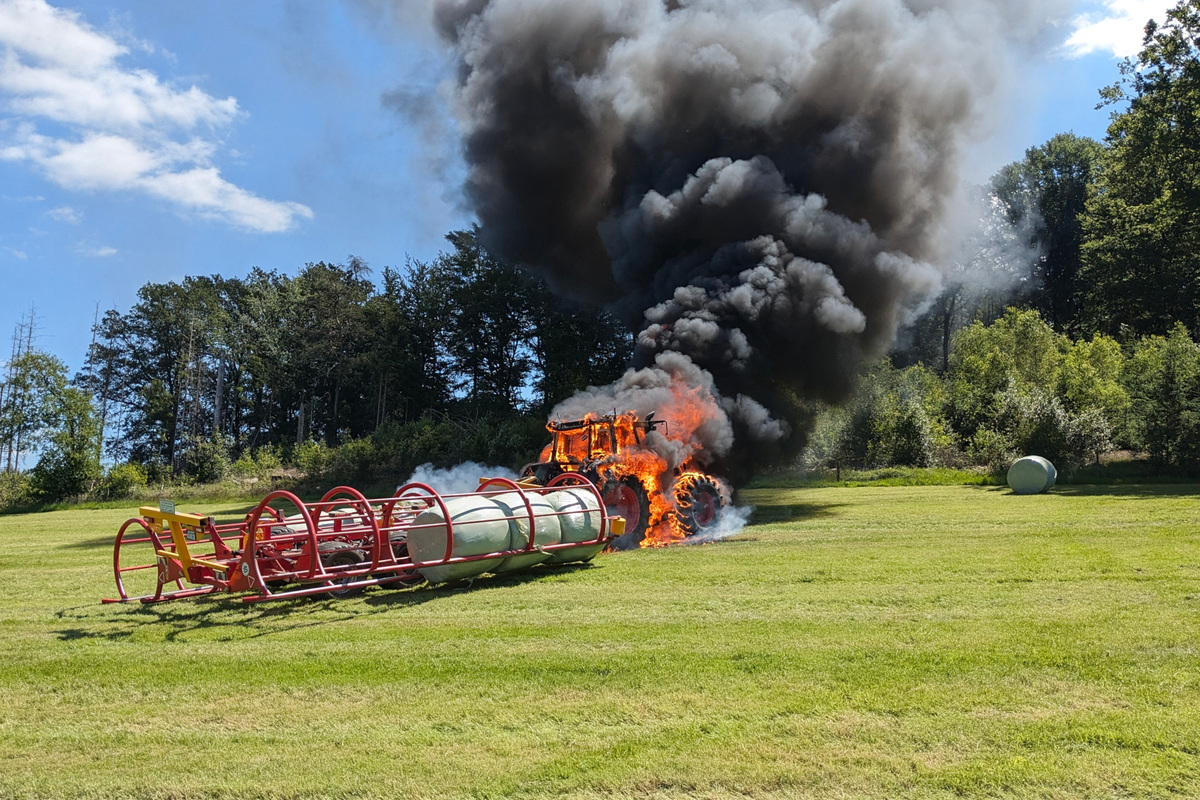 Aus bisher ungeklärter Ursache hatte der Traktor während der Feldarbeit Feuer gefangen, bei Eintreffen der ersten Kräfte stand das Fahrzeug bereits in Vollbrand.
